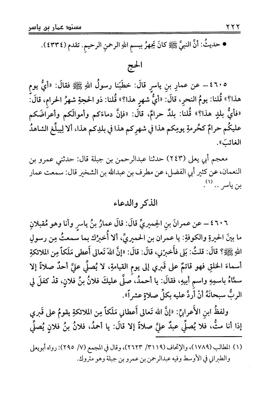 4606 - عن عمرانَ بنِ الحِميريِّ قالَ: قالَ عمارُ بنُ ياسرٍ وأنا وهو مُقبلانِ ما بينَ الحيرةِ والكوفةِ: يا عمران بن الحميريِّ، ألا أُخبرُك بما سمعتُ مِن رسولِ اللهِ صلى الله عليه وسلم؟ قالَ: قلتُ: بَلى فأَخبرْني، قالَ: قالَ: «إنَّ اللهَ تَعالى أَعطى مَلَكاً مِن الملائكةِ أسماءَ الخلقِ فهو قائمٌ على قَبري إلى يومِ القيامةِ، لا يُصلِّي عليَّ أحدٌ صلاةً إلا سمَّاهُ باسمِهِ واسمِ أبيهِ، فقالَ: يا أحمدُ، صلَّى عليكَ فلانُ بنُ فلانٍ، قدْ كفلَ لي الربُّ سبحانَهُ أنْ أردَّ عليه بكلِّ صلاةٍ عشراً».