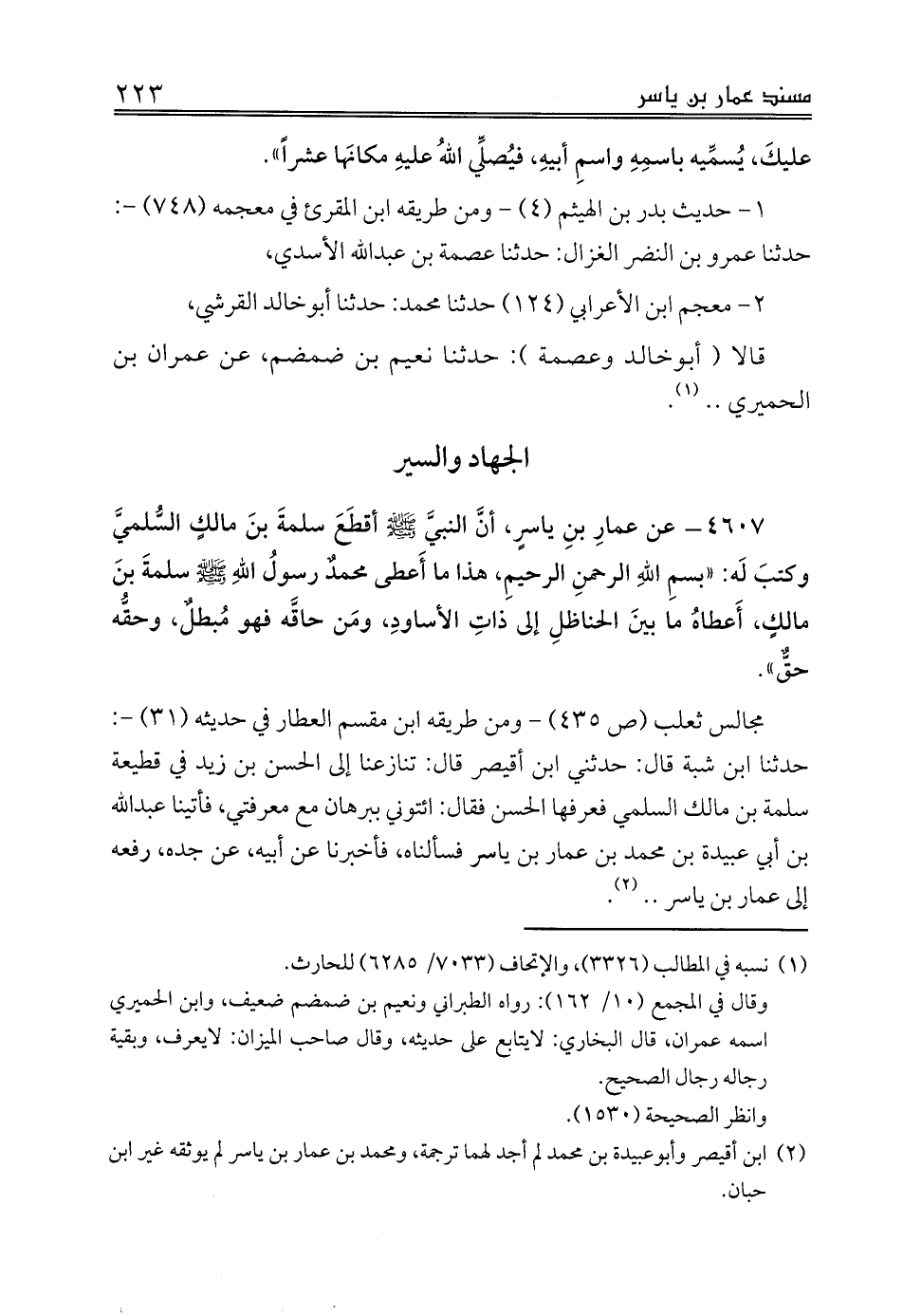 4607 - عن عمارِ بنِ ياسرٍ، أنَّ النبيَّ صلى الله عليه وسلم أقطَعَ سلمةَ بنَ مالكٍ السُّلميَّ وكتبَ لَه: «بسمِ اللهِ الرحمنِ الرحيمِ، هذا ماأَعطى محمدٌ رسولَ اللهِ صلى الله عليه وسلم سلمةَ بنَ مالكٍ، أَعطاهُ ما بينَ الحناظلِ إلى ذاتِ الأساودِ، ومَن حاقَّه فهو مُبطلٌ، وحقُّه حقٌّ».