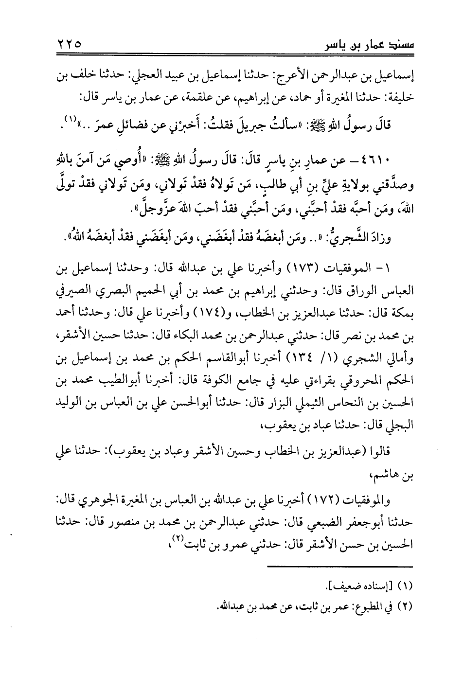 1 - الموفقيات (173) وأخبرنا علي بن عبدالله قال: وحدثنا إسماعيل بن العباس الوراق قال: وحدثني إبراهيم بن محمد بن أبي الحميم البصري الصيرفي بمكة قال: حدثنا عبدالعزيز بن الخطاب، و (174) وأخبرنا علي قال: وحدثنا أحمد بن محمد بن نصر قال: حدثني عبدالرحمن بن محمد البكاء قال: حدثنا حسين الأشقر، وأمالي الشجري (1/ 134) أخبرنا أبوالقاسم الحكم بن محمد بن إسماعيل بن الحكم المحروقي بقراءتي عليه في جامع الكوفة قال: أخبرنا أبوالطيب محمد بن الحسين بن النحاس الثيملي البزار قال: حدثنا أبوالحسن علي بن العباس بن الوليد البجلي قال: حدثنا عباد بن يعقوب،