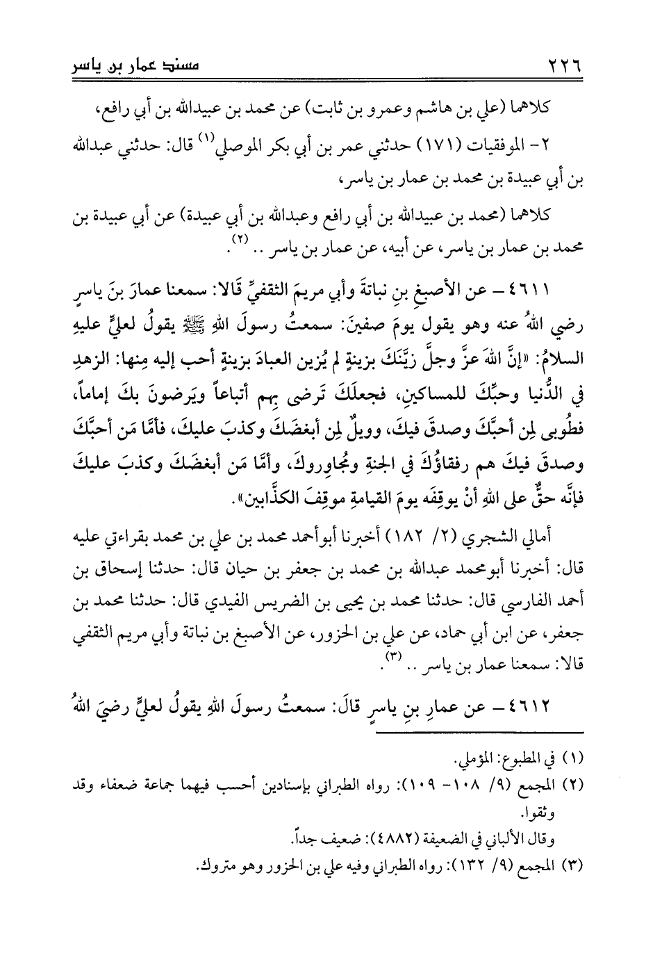 4611 - عن الأصبغِ بنِ نباتةَ وأبي مريمَ الثقفيِّ قَالا: سمعنا عمارَ بنَ ياسرٍ رضي اللهُ عنه وهو يقول يومَ صفينَ: سمعتُ رسولَ اللهِ صلى الله عليه وسلم يقولُ لعليٍّ عليهِ السلامُ: «إنَّ اللهَ عزَّ وجلَّ زيَّنَكَ بزينةٍ لم يُزين العبادَ بزينةٍ أحب إليه مِنها: الزهدِ في الدُّنيا وحبِّكَ للمساكينِ، فجعلَكَ تَرضى بِهم أتباعاً ويَرضونَ بكَ إماماً، فطُوبى لِمن أحبَّكَ وصدقَ فيكَ، وويلٌ لِمن أبغضَكَ وكذبَ عليكَ، فأمَّا مَن أحبَّكَ وصدقَ فيكَ هم رفقاؤُكَ في الجنةِ ومُجاوِروكَ، وأمَّا مَن أبغضَكَ وكذبَ عليكَ فإنَّه حقٌّ على اللهِ أنْ يوقِفَه يومَ القيامةِ موقِفَ الكذَّابين».
