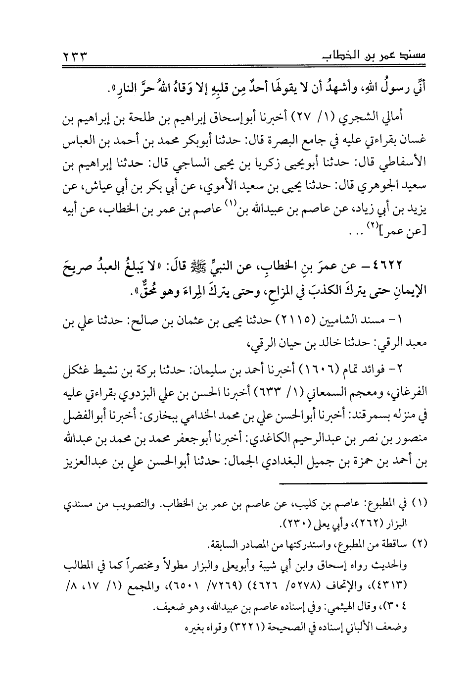 أمالي الشجري (1/ 27) أخبرنا أبوإسحاق إبراهيم بن طلحة بن إبراهيم بن غسان بقراءتي عليه في جامع البصرة قال: حدثنا أبوبكر محمد بن أحمد بن العباس الأسفاطي قال: حدثنا أبويحيى زكريا بن يحيى الساجي قال: حدثنا إبراهيم بن سعيد الجوهري قال: حدثنا يحيى بن سعيد الأموي، عن أبي بكر بن أبي عياش، عن يزيد بن أبي زياد، عن عاصم بن عبيدالله بن (¬1) عاصم بن عمر بن الخطاب، عن أبيه [عن عمر] (¬2) .. .