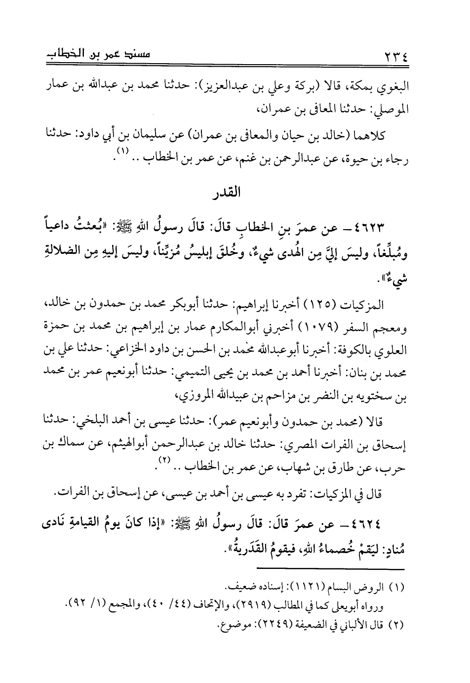 كلاهما (خالد بن حيان والمعافى بن عمران) عن سليمان بن أبي داود: حدثنا رجاء بن حيوة، عن عبدالرحمن بن غنم، عن عمر بن الخطاب .. (¬1).