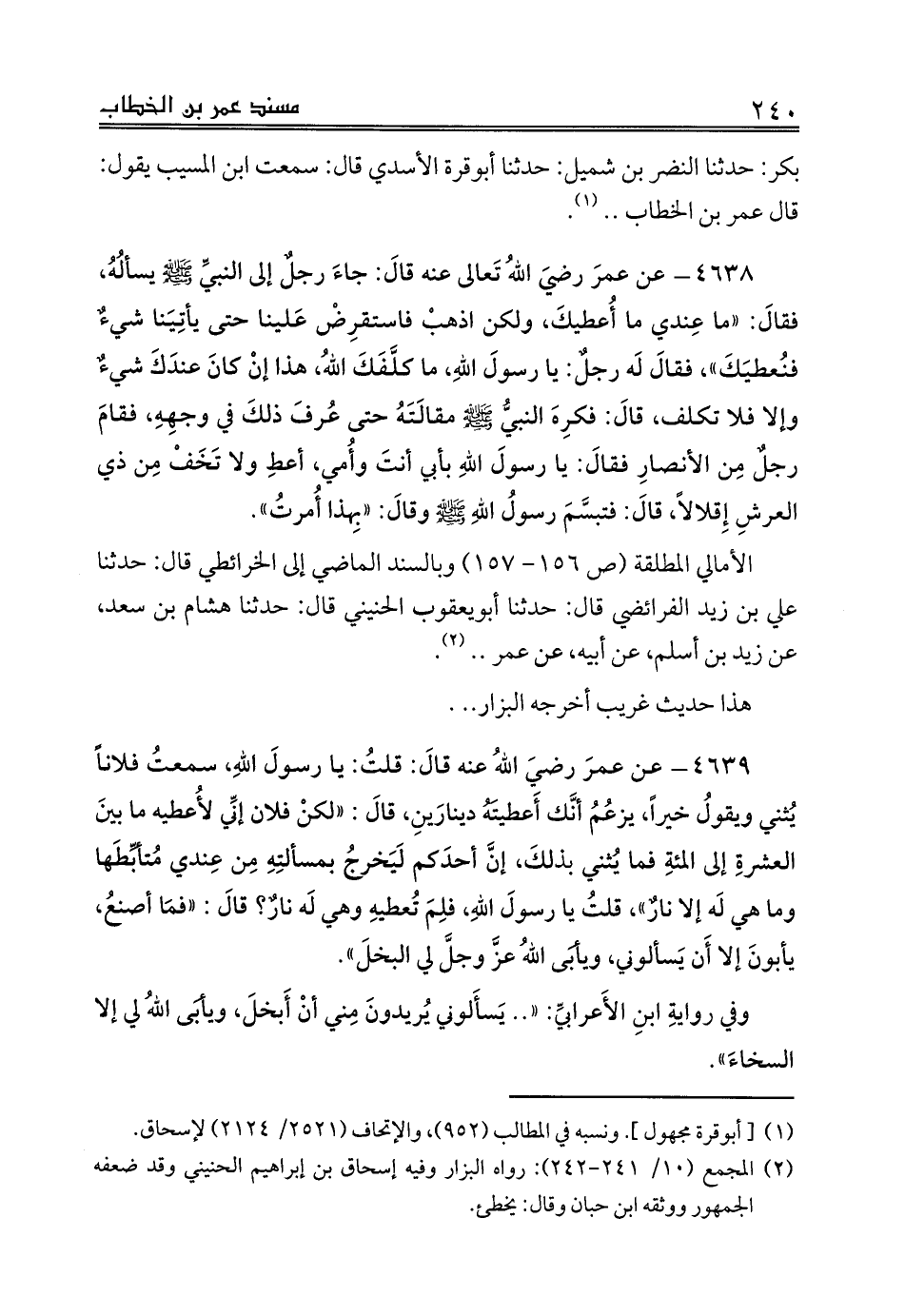 4639 - عن عمرَ رضيَ اللهُ عنه قالَ: قلتُ: يا رسولَ اللهِ، سمعتُ فلاناً يُثني ويقولُ خيراً، يزعُمُ أنَّك أَعطيتَهُ دينارَينِ، قالَ: «لكن فلان إنِّي لأُعطيه ما بينَ العشرةِ إلى المئةِ فما يُثني بذلكَ، إنَّ أحدَكم لَيَخرجُ بمسألتِهِ مِن عِندي مُتأبِّطَها وما هي لَه إلا نارٌ»، قلتُ يا رسولَ اللهِ، فلِمَ تُعطيهِ وهي لَه نارٌ؟ قالَ: «فمَا أصنعُ، يأبونَ إلا أَن يَسألوني، ويأبَى اللهُ عزَّ وجلَّ لي البخلَ».