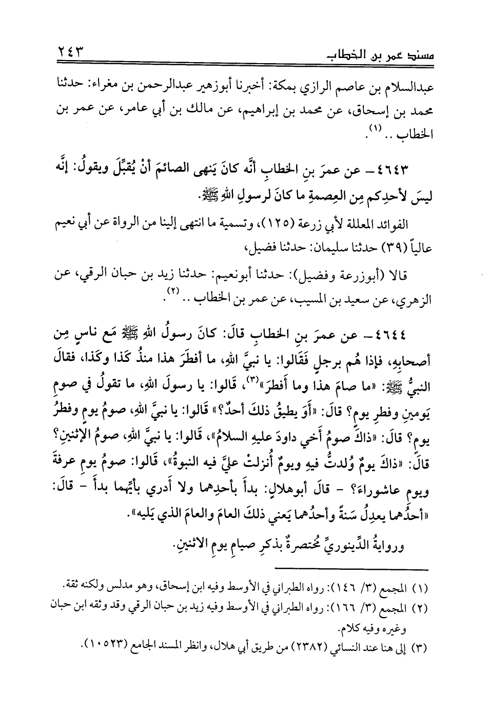4644 - عن عمرَ بنِ الخطابِ قالَ: كانَ رسولُ اللهِ صلى الله عليه وسلم مَع ناسٍ مِن أصحابِهِ، فإذا هُم برجلٍ فَقَالوا: يا نبيَّ اللهِ، ما أفطَرَ هذا منذُ كَذا وكَذا، فقالَ النبيُّ صلى الله عليه وسلم: «ما صامَ هذا وما أَفطرَ» (¬3)، قَالوا: يا رسولَ اللهِ، ما تقولُ في صومِ يَومينِ وفطرِ يومٍ؟ قالَ: «أَوَ يطيقُ ذلكَ أحدٌ؟» قَالوا: يا نبيَّ اللهِ، صومُ يومٍ وفطرُ يومٍ؟ قالَ: «ذاكَ صومُ أَخي داودَ عليهِ السلامُ»، قَالوا: يا نبيَّ اللهِ، صومُ الإثنينِ؟ قالَ: «ذاكَ يومٌ وُلدتُ فيهِ ويومٌ أُنزلتْ عليَّ فيه النبوةُ»، قَالوا: صومُ يومِ عرفةَ ويومِ عاشوراءَ؟ - قالَ أبوهلالٍ: بدأَ بأحدِهما ولا أَدري بأيِّهما بدأَ - قالَ: «أحدُهما يعدِلُ سَنةً وأحدُهما يَعني ذلكَ العامَ والعامَ الذي يَليه».