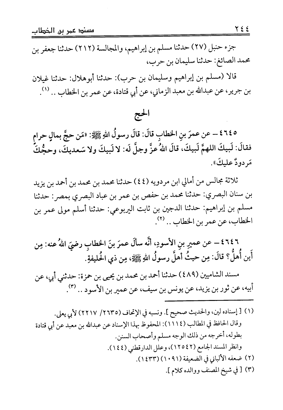 4645 - عن عمرَ بنِ الخطابِ قالَ: قالَ رسولُ اللهِ صلى الله عليه وسلم: «مَن حجَّ بمالٍ حرامٍ فقالَ: لَبيكَ اللهمَّ لَبيكَ، قالَ اللهُ عزَّ وجلَّ لَه: لا لَبيكَ ولا سَعديكَ، وحجُّكَ مَردودٌ عليكَ».