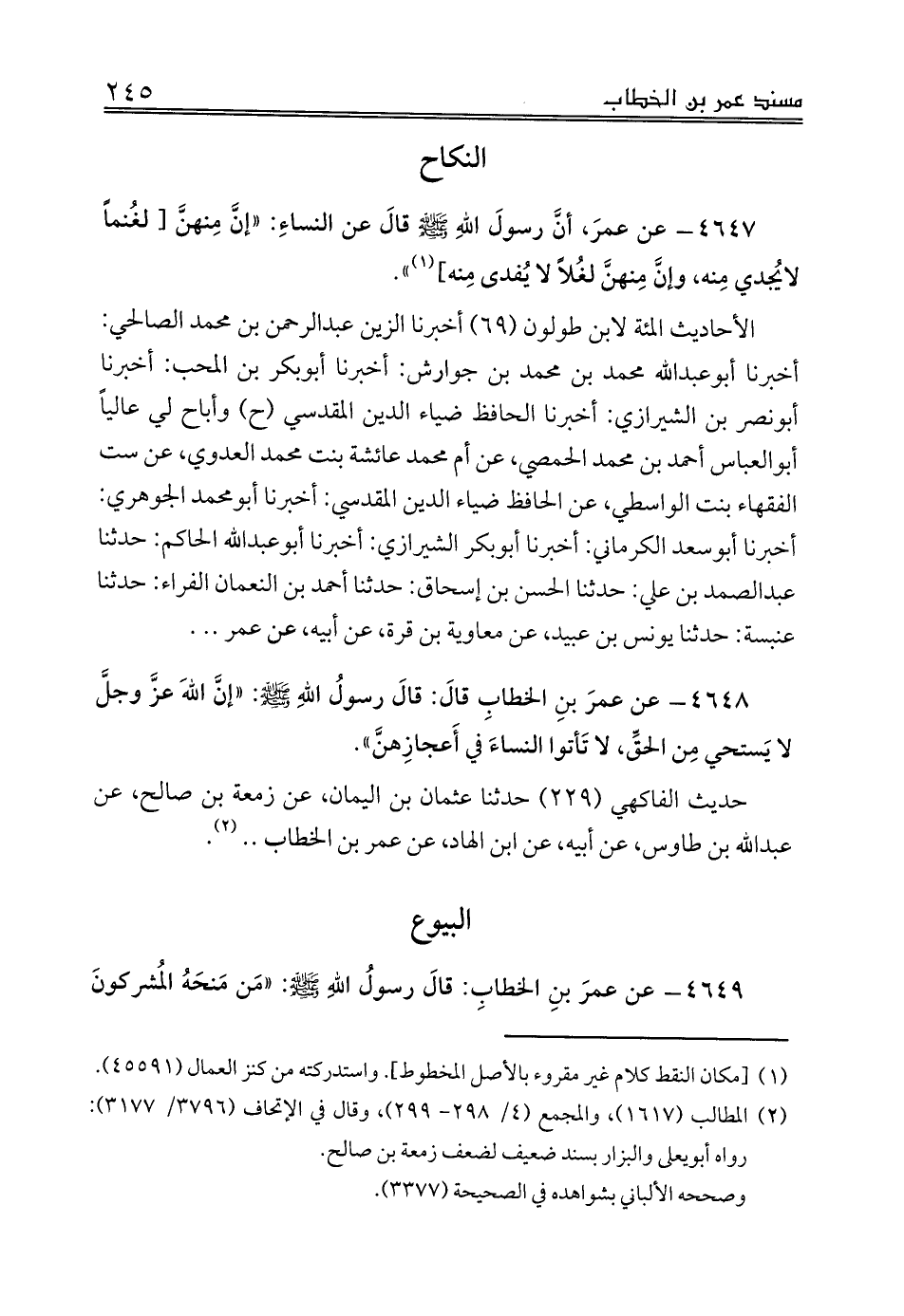 الأحاديث المئة لابن طولون (69) أخبرنا الزين عبدالرحمن بن محمد الصالحي: أخبرنا أبوعبدالله محمد بن محمد بن جوارش: أخبرنا أبوبكر بن المحب: أخبرنا أبونصر بن الشيرازي: أخبرنا الحافظ ضياء الدين المقدسي (ح) وأباح لي عالياً أبوالعباس أحمد بن محمد الحمصي، عن أم محمد عائشة بنت محمد العدوي، عن ست الفقهاء بنت الواسطي، عن الحافظ ضياء الدين المقدسي: أخبرنا أبومحمد الجوهري: أخبرنا أبوسعد الكرماني: أخبرنا أبوبكر الشيرازي: أخبرنا أبوعبدالله الحاكم: حدثنا عبدالصمد بن علي: حدثنا الحسن بن إسحاق: حدثنا أحمد بن النعمان الفراء: حدثنا عنبسة: حدثنا يونس بن عبيد، عن معاوية بن قرة، عن أبيه، عن عمر .. .