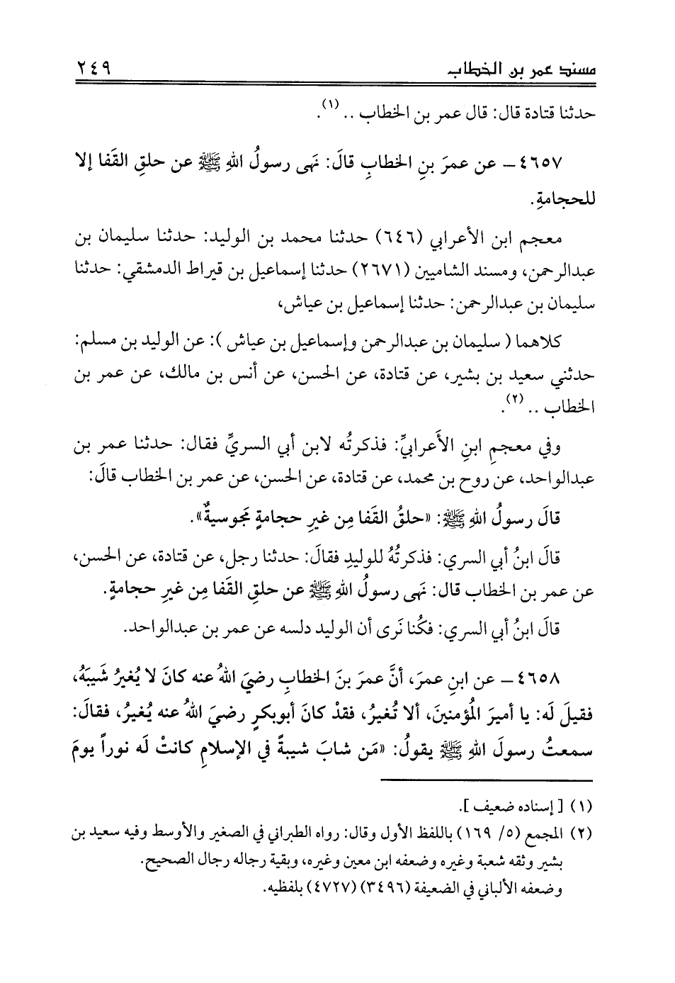 4657 - عن عمرَ بنِ الخطابِ قالَ: نَهى رسولُ اللهِ صلى الله عليه وسلم عن حلقِ القَفا إلا للحجامةِ.