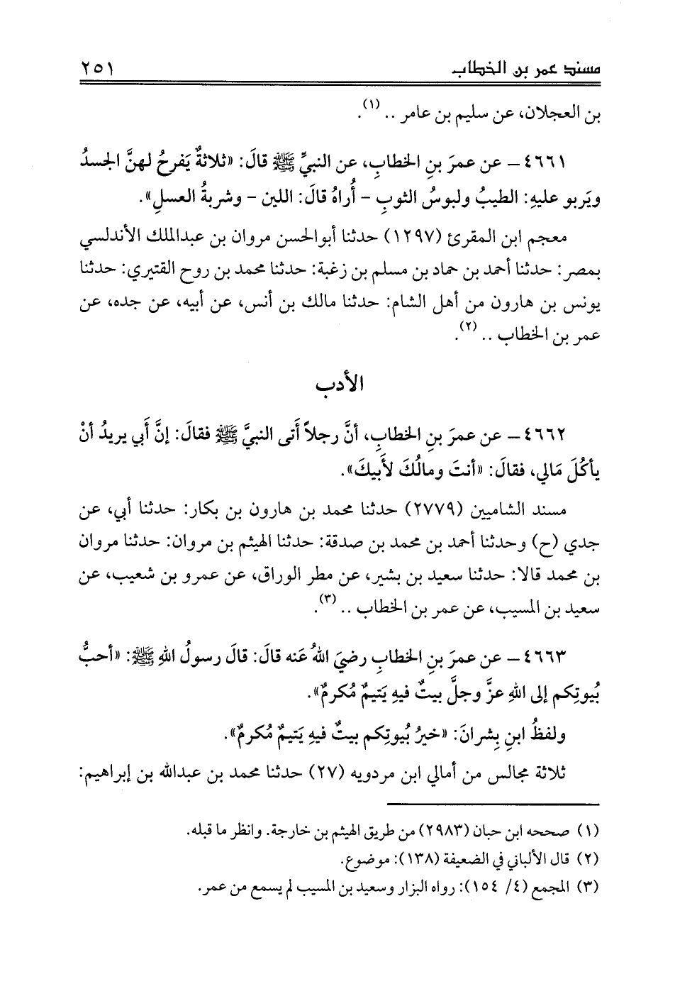 4661 - عن عمرَ بنِ الخطابِ، عن النبيِّ صلى الله عليه وسلم قالَ: «ثلاثةٌ يَفرحُ لهنَّ الجسدُ ويَربو عليهِ: الطيبُ ولبوسُ الثوبِ - أُراهُ قالَ: اللين - وشربةُ العسلِ».