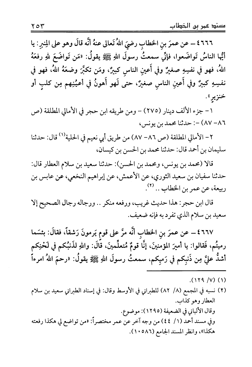 4666 - عن عمرَ بنِ الخطابِ رضيَ اللهُ تَعالى عنهُ أنَّه قالَ وهو على المِنبرِ: يا أيُّها الناسُ تَواضَعوا، فإنِّي سمعتُ رسولَ اللهِ صلى الله عليه وسلم يقولُ: «مَن تَواضَعَ للهِ رفعَهُ اللهُ، فهو في نفسِهِ صغيرٌ وفي أَعينِ الناسِ كبيرٌ، ومَن تكبَّرَ وضعَهُ اللهُ، فهو في نفسِهِ كبيرٌ وفي أَعينِ الناسِ صغيرٌ، حتى لَهو أَهونُ في أعيُنِهم مِن كلبٍ أو خنزيرٍ».