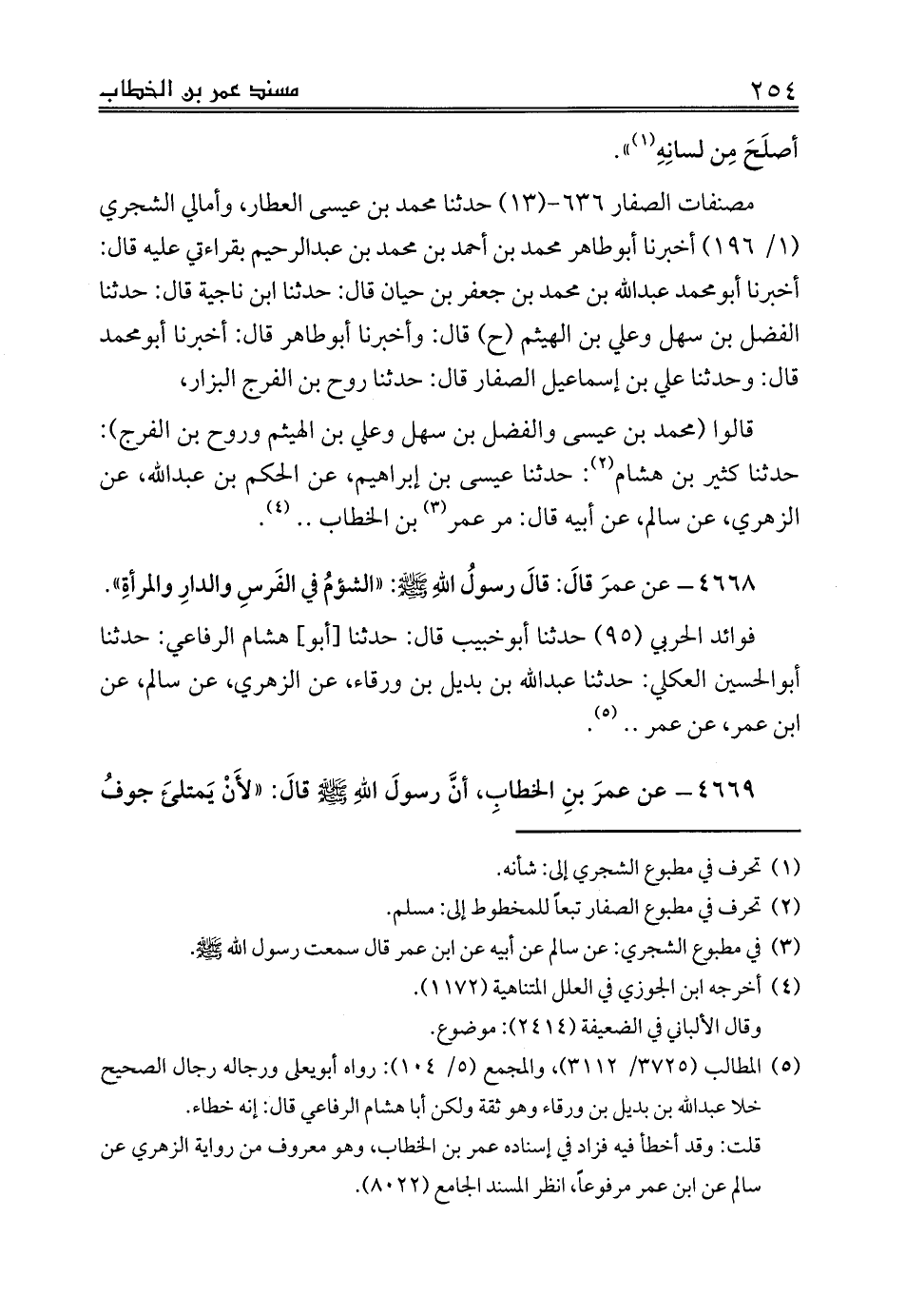 4668 - عن عمرَ قالَ: قالَ رسولُ اللهِ صلى الله عليه وسلم: «الشؤمُ في الفَرسِ والدارِ والمرأةِ».
