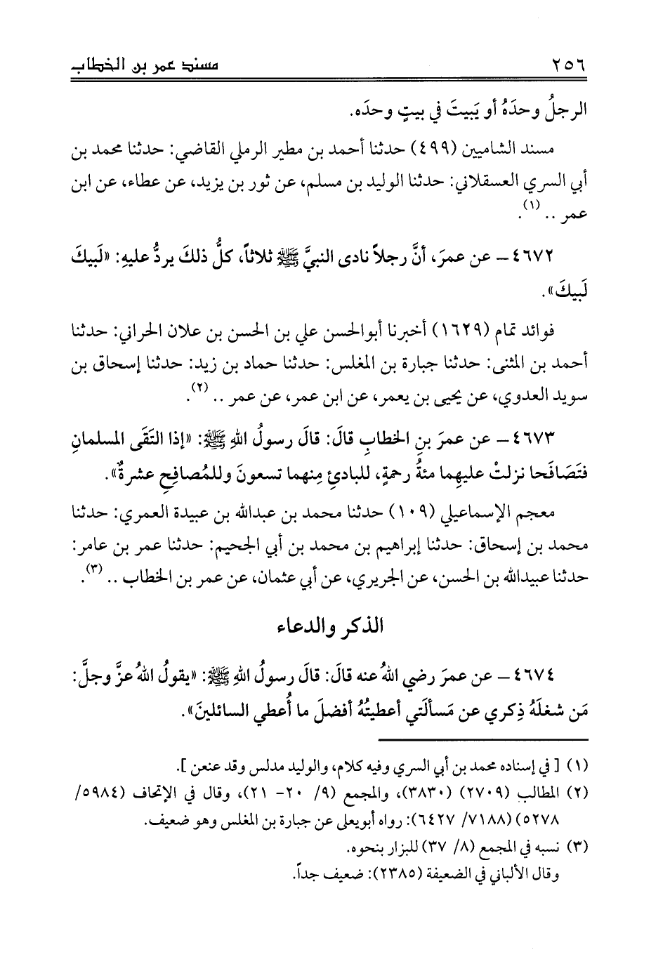 4672 - عن عمرَ، أنَّ رجلاً نادى النبيَّ صلى الله عليه وسلم ثلاثاً، كلُّ ذلكَ يردُّ عليهِ: «لَبيكَ لَبيكَ».