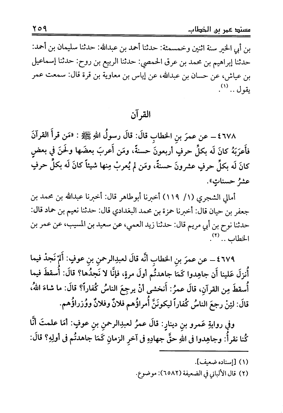 4678 - عن عمرَ بنِ الخطابِ قالَ: قالَ رسولُ اللهِ صلى الله عليه وسلم: «مَن قرأَ القرآنَ فأَعرَبَهُ كانَ لَه بكلِّ حرفٍ أربعونَ حسنةً، ومَن أَعربَ بعضَها ولَحنَ في بعضٍ كانَ لَه بكلِّ حرفٍ عشرونَ حسنةً، ومَن لم يُعربْ مِنها شيئاً كانَ لَه بكلِّ حرفٍ عشرُ حسناتٍ».