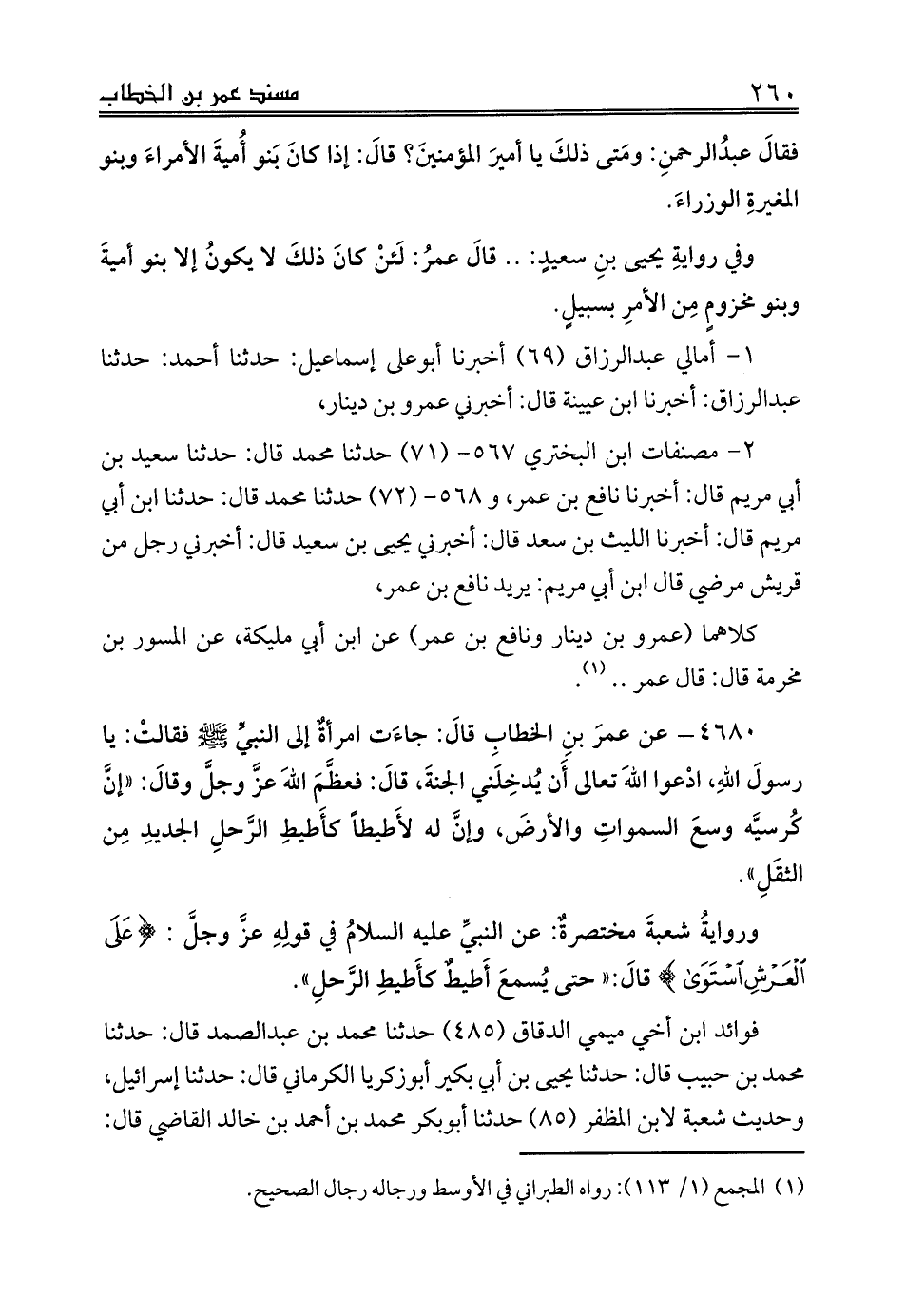 فقالَ عبدُالرحمنِ: ومَتى ذلكَ يا أميرَ المؤمنينَ؟ قالَ: إذا كانَ بَنو أُميةَ الأمراءَ وبنو المغيرةِ الوزراءَ.