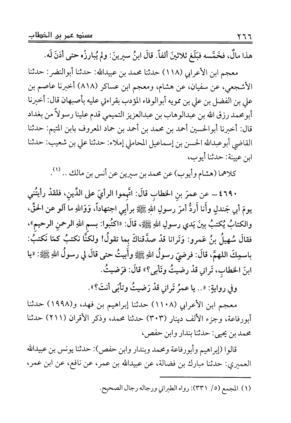 4690 - عن عمرَ بنِ الخطابِ قالَ: اتَّهِموا الرأيَ على الدِّينِ، فلقدْ رأيتُني يومَ أبي جَندلٍ وأَنا أَردُّ أمرَ رسولِ اللهِ صلى الله عليه وسلم برأيِي اجتهاداً، وَوَاللهِ ما آلو عن الحقِّ، والكتابُ يُكتبُ بينَ يَدي رسولِ اللهِ صلى الله عليه وسلم، قالَ: «اكتُبوا: بسمِ اللهِ الرحمنِ الرحيمِ»، فقالَ سُهيلُ بنُ عَمرو: وَتَرانا قدْ صدَّقناكَ بِما تقولُ! ولكنَّا نكتبُ كمَا نَكتبُ: باسمِكَ اللهمَّ، قالَ: فرضيَ رسولُ اللهِ صلى الله عليه وسلم وأَبيتُ حتى قالَ لي رسولُ اللهِ صلى الله عليه وسلم: «يا ابنَ الخطابِ، تَراني قدْ رضيتُ وتَأبى؟» قالَ: فرَضيتُ.
