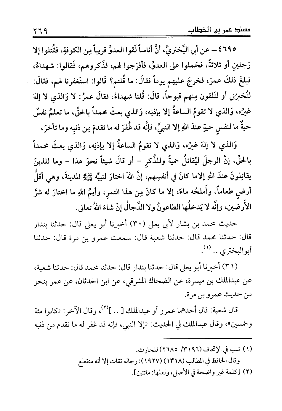 (31) أخبرنا أبو يعلى قال: حدثنا بندار قال: حدثنا محمد قال: حدثنا شعبة، عن عبدالملك بن ميسرة، عن الضحاك المشرقي، عن ابن الحدثان، عن عمر بنحو من حديث عمرو بن مرة.