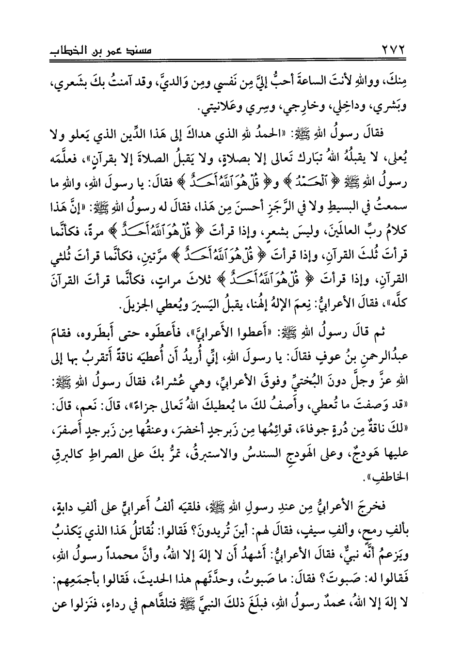 فقالَ رسولُ اللهِ صلى الله عليه وسلم: «الحمدُ للهِ الذي هداكَ إلى هَذا الدِّين الذي يَعلو ولا يُعلى، لا يقبلُهُ اللهُ تبَارك تَعالى إلا بصلاةٍ، ولا يَقبلُ الصلاةَ إلا بقرآنٍ»، فعلَّمَه رسولُ اللهِ صلى الله عليه وسلم {الْحَمْدُ} و {قُلْ هُوَ اللَّهُ أَحَدٌ} فقالَ: يا رسولَ اللهِ، واللهِ ما سمعتُ في البسيطِ ولا في الرَّجَزِ أحسنَ مِن هَذا، فقالَ له رسولُ اللهِ صلى الله عليه وسلم: «إنَّ هَذا كلامُ ربِّ العالَمينَ، وليسَ بشعرٍ، وإذا قرأتَ {قُلْ هُوَ اللَّهُ أَحَدٌ} مرةً، فكأنَّما قرأتَ ثُلثي القرآنِ، وإذا قرأتَ {قُلْ هُوَ اللَّهُ أَحَدٌ} مرَّتينِ، فكأنَّما قرأتَ ثُلثي القرآنِ، وإذا قرأتَ {قُلْ هُوَ اللَّهُ أَحَدٌ} ثلاثَ مراتٍ، فكأنَّما قرأتَ القرآنَ كلَّه»، فقالَ الأعرابيُّ: نِعمَ الإلهُ إلهُنا، يقبلُ اليَسيرَ ويُعطي الجزيلَ.