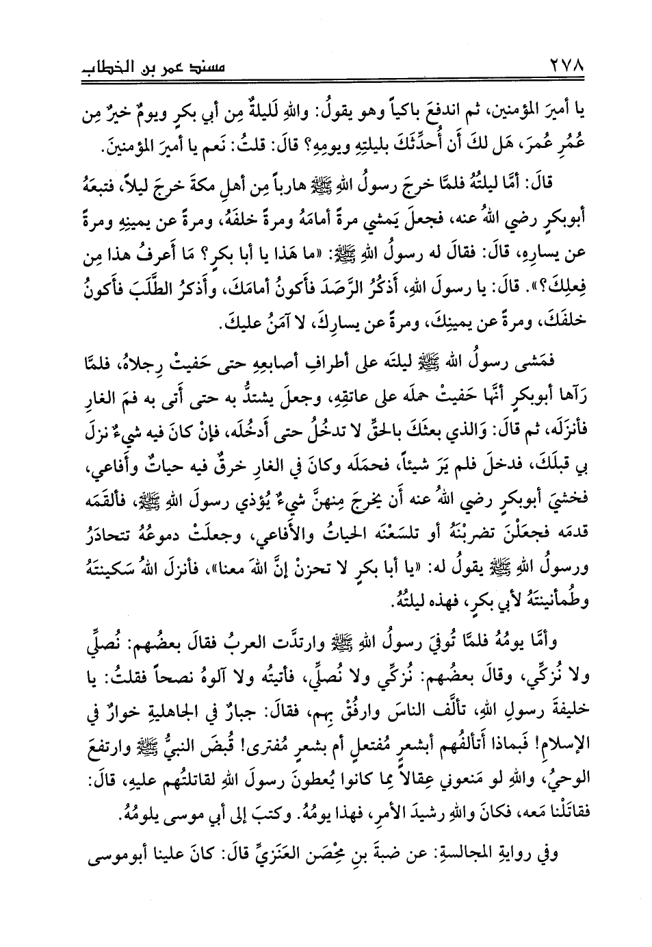 يا أميرَ المؤمنين، ثم اندفعَ باكياً وهو يقولُ: واللهِ لَليلةٌ مِن أبي بكرٍ ويومٌ خيرٌ مِن عُمُرِ عُمرَ، هَل لكَ أَن أُحدِّثَكَ بليلتِهِ ويومِهِ؟ قالَ: قلتُ: نَعم يا أميرَ المؤمنينَ.