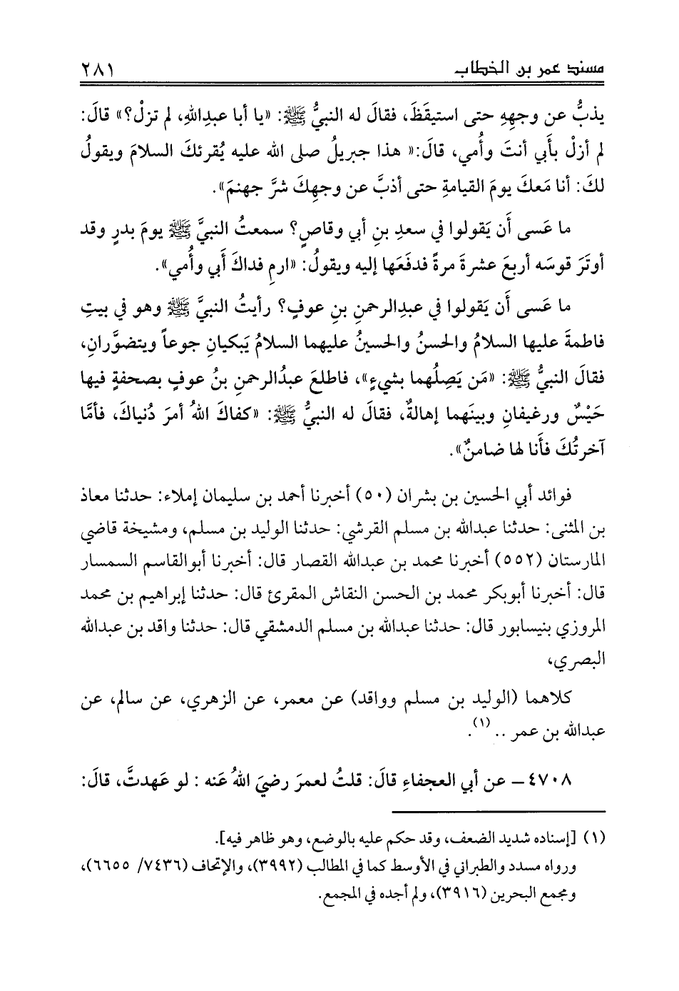 يذبُّ عن وجهِهِ حتى استيقَظَ، فقالَ له النبيُّ صلى الله عليه وسلم: «يا أبا عبدِاللهِ، لم تزلْ؟» قالَ: لم أزلْ بأَبي أنتَ وأُمي، قالَ: «هذا جبريلُ صلى الله عليه يُقرئكَ السلامَ ويقولُ لكَ: أنا مَعكَ يومَ القيامةِ حتى أذبَّ عن وجهِكَ شرَّ جهنمَ».