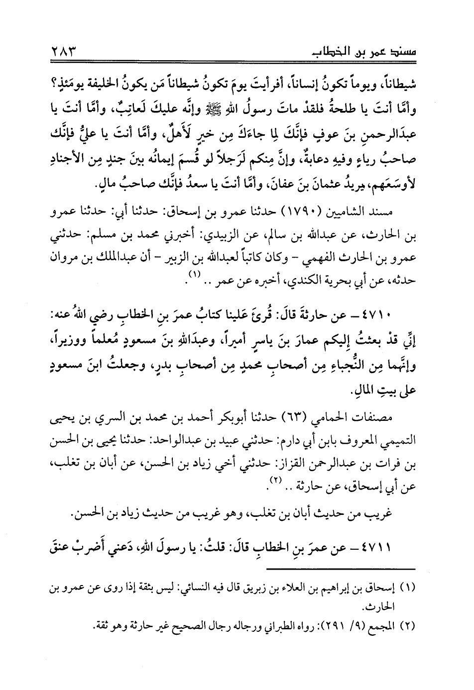 4710 - عن حارثةَ قالَ: قُرئَ عَلينا كتابُ عمرَ بنِ الخطابِ رضي اللهُ عنه: إنِّي قدْ بعثتُ إِليكم عمارَ بنَ ياسرٍ أميراً، وعبدَاللهِ بنَ مسعودٍ مُعلماً ووزيراً، وإنَّهما مِن النُّجباءِ مِن أصحابِ محمدٍ مِن أصحابِ بدرٍ، وجعلتُ ابنَ مسعودٍ على بيتِ المالِ.