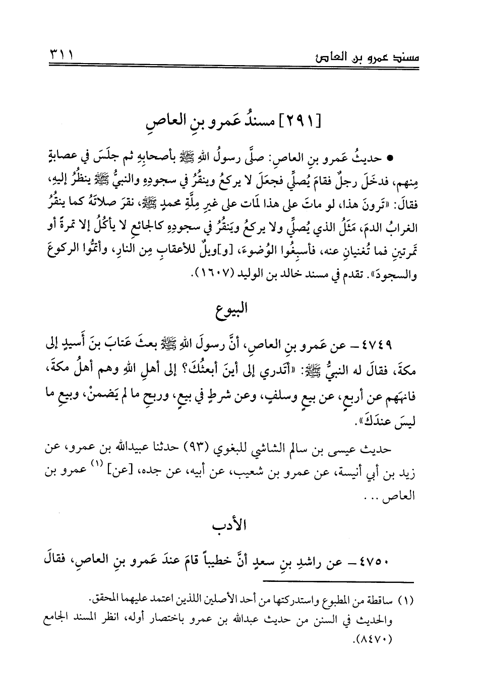 * حديثُ عَمرو بنِ العاصِ: صلَّى رسولُ اللهِ صلى الله عليه وسلم بأصحابِهِ ثم جلَسَ في عصابةٍ مِنهم، فدخَلَ رجلٌ فقامَ يُصلِّي فجعَلَ لا يركعُ وينقُرُ في سجودِهِ والنبيُّ صلى الله عليه وسلم ينظُرُ إليهِ، فقالَ: «تَرونَ هذا، لو ماتَ على هذا لَمَات على غيرِ مِلَّةِ محمدٍ صلى الله عليه وسلم، نقرَ صلاتَهُ كما ينقُرُ الغرابُ الدمَ، مَثَلُ الذي يُصلِّي ولا يركعُ ويَنقُرُ في سجودِهِ كالجائعِ لا يأكُلُ إلا تمرةً أو تَمرتينِ فما تُغنيانِ عنه، فأسبِغُوا الوُضوءَ، [و] ويلٌ للأعقابِ مِن النارِ، وأتمُّوا الركوعَ والسجودَ». تقدم في مسند خالد بن الوليد (1607).