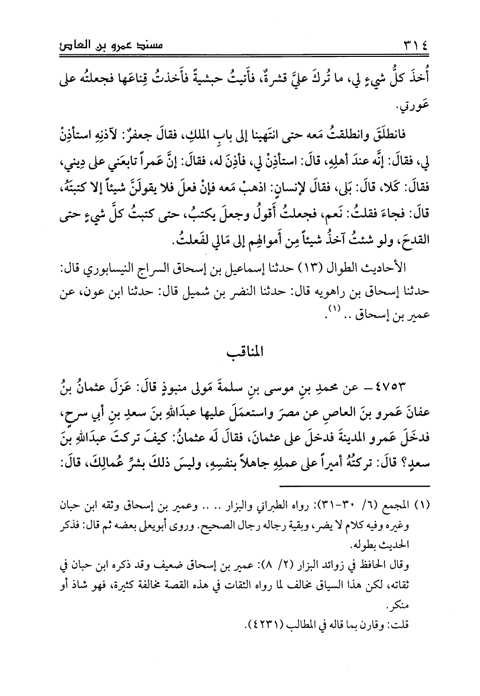 4753 - عن محمدِ بنِ موسى بنِ سلمةَ مَولى منبوذٍ قالَ: عَزلَ عثمانُ بنُ عفانَ عَمرو بنَ العاصِ عن مصرَ واستعمَلَ عليها عبدَاللهِ بنَ سعدِ بنِ أبي سرحٍ، فدخَلَ عَمرو المدينةَ فدخلَ على عثمانَ، فقالَ لَه عثمانُ: كيفَ تركتَ عبدَاللهِ بنَ سعدٍ؟ قالَ: تركتُهُ أميراً على عملِهِ جاهلاً بنفسِهِ، وليسَ ذلكَ بشرِّ عُمالِكَ، قالَ: