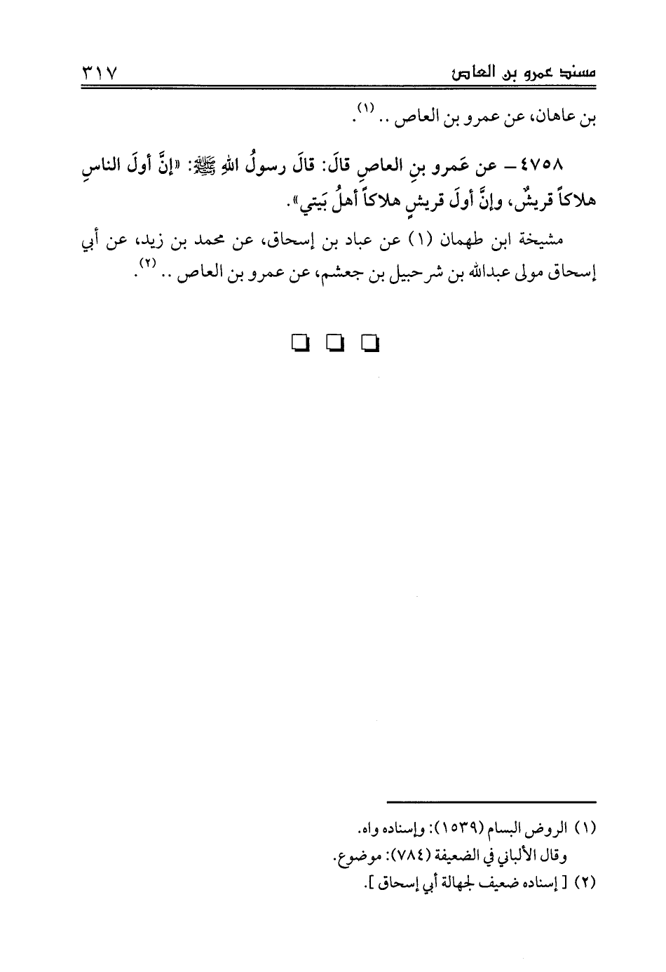 4758 - عن عَمرو بنِ العاصِ قالَ: قالَ رسولُ اللهِ صلى الله عليه وسلم: «إنَّ أولَ الناسِ هلاكاً قريشٌ، وإنَّ أولَ قريشٍ هلاكاً أهلُ بَيتي».