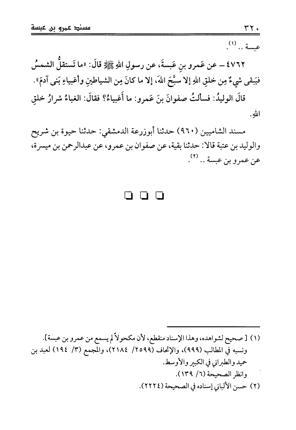 4762 - عن عَمرو بنِ عَبسةَ، عن رسولِ اللهِ صلى الله عليه وسلم قالَ: «ما تَستقلُّ الشمسُ فيَبقى شيءٌ مِن خلقِ اللهِ إلا سبَّحَ اللهَ، إلا ما كانَ مِن الشياطينِ وأغبياءِ بَنى آدمَ».