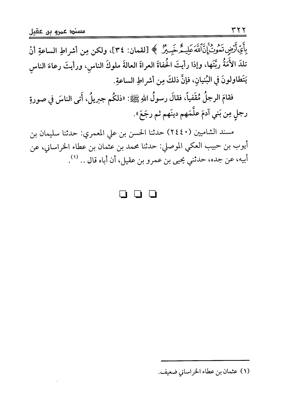 مسند الشاميين (2440) حدثنا الحسن بن علي المعمري: حدثنا سليمان بن أيوب بن حبيب العكي الموصلي: حدثنا محمد بن عثمان بن عطاء الخراساني، عن أبيه، عن جده، حدثني يحيى بن عمرو بن عقيل، أن أباه قال .. (¬1).