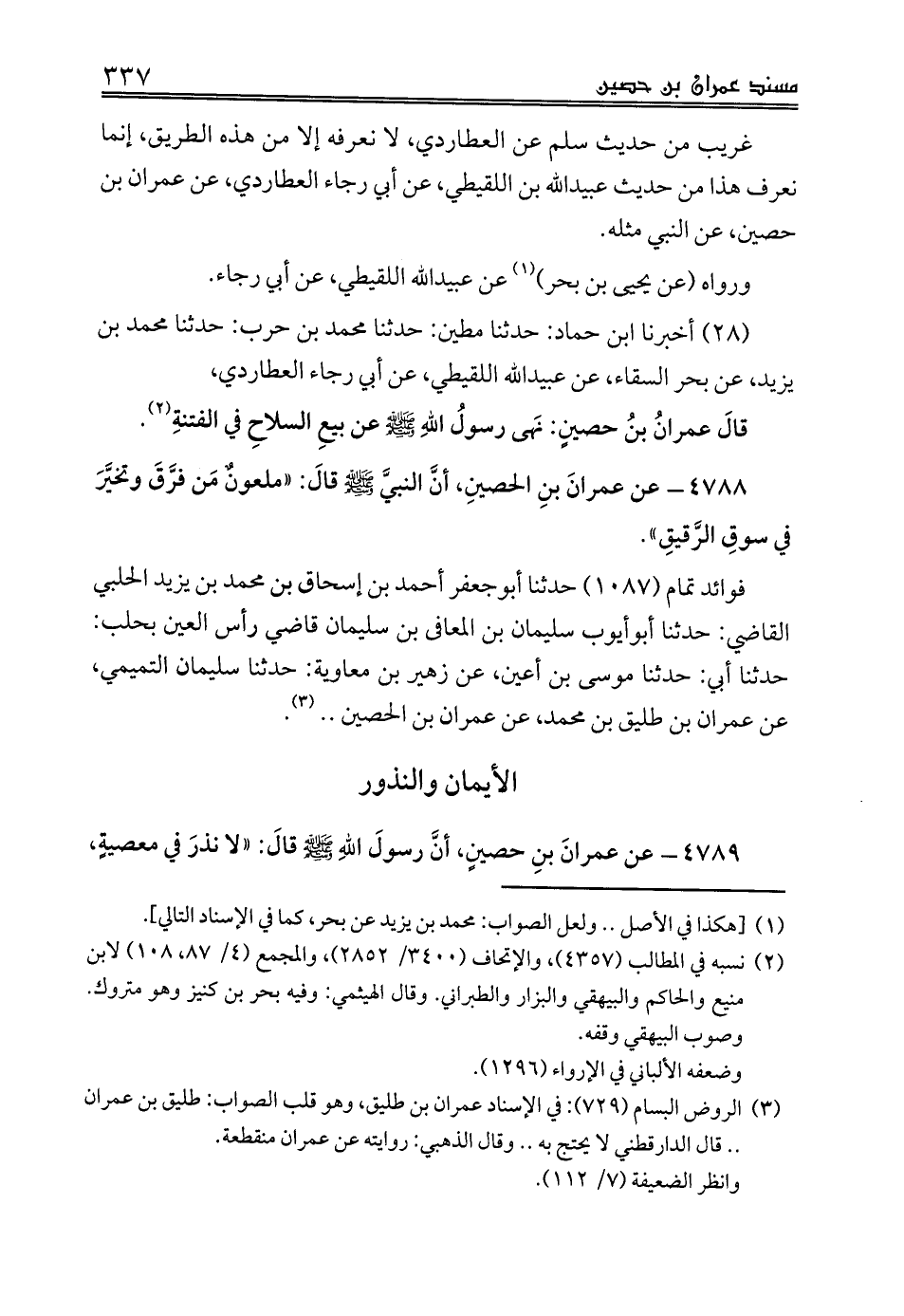 4789 - عن عمرانَ بنِ حصينٍ، أنَّ رسولَ اللهِ صلى الله عليه وسلم قالَ: «لا نذرَ في معصيةٍ،