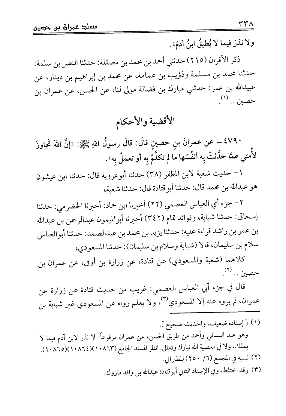 4790 - عن عمرانَ بنِ حصينٍ قالَ: قالَ رسولُ اللهِ صلى الله عليه وسلم: «إنَّ اللهَ تَجاوزَ لأُمتي عمَّا حدَّثتْ بِه أنفُسَها ما لم تكلَّمْ بِه أو تعملْ بِه».