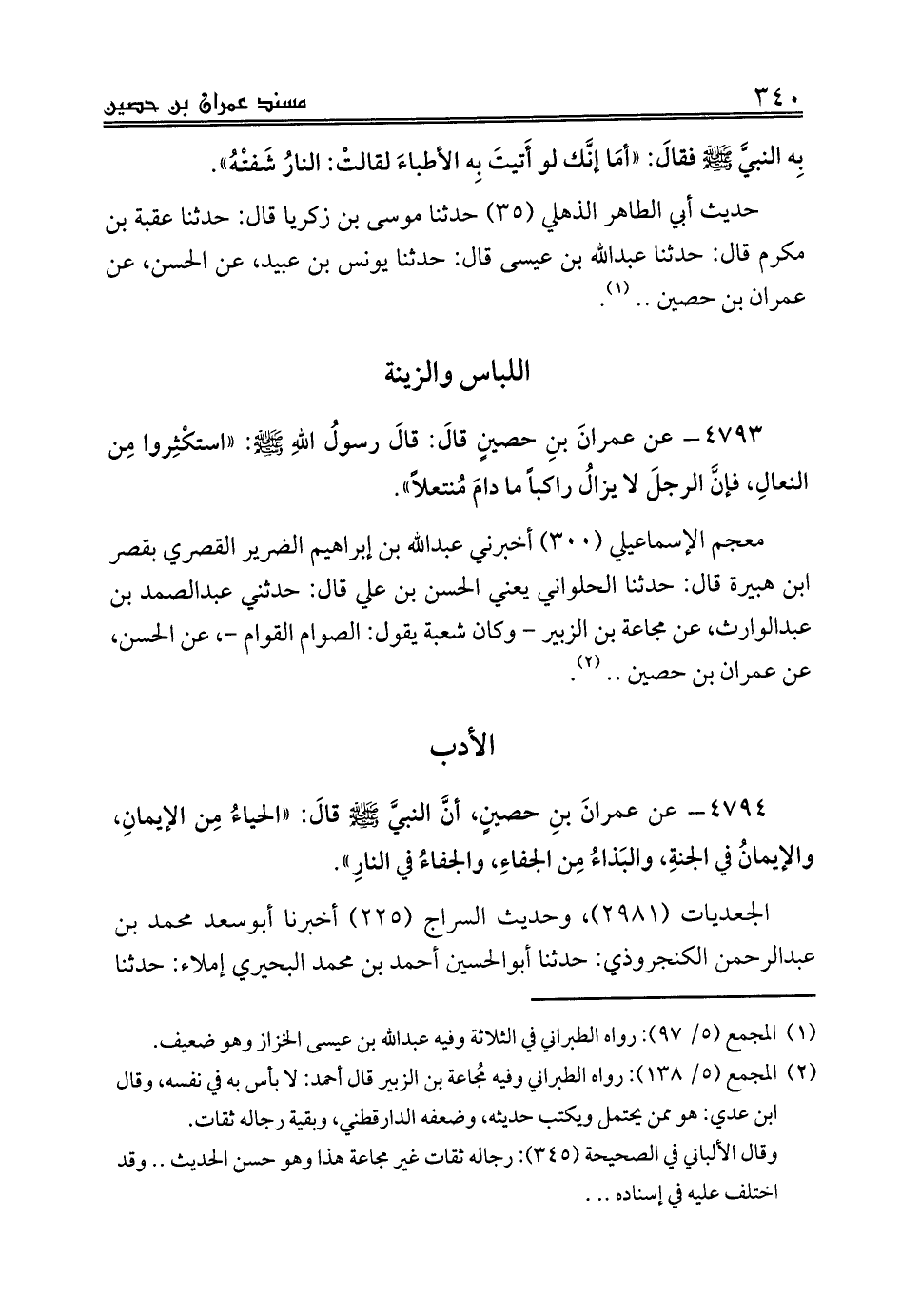 4793 - عن عمرانَ بنِ حصينٍ قالَ: قالَ رسولُ اللهِ صلى الله عليه وسلم: «استكْثِروا مِن النعالِ، فإنَّ الرجلَ لا يزالُ راكباً ما دامَ مُنتعلاً».