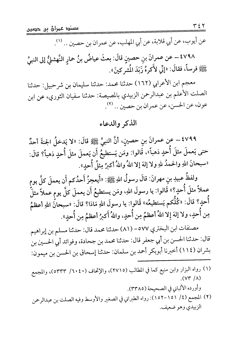 4799 - عن عمرانَ بنِ حصينٍ، أنَّ النبيَّ صلى الله عليه وسلم قالَ: «لا يَدخلُ الجنةَ أحدٌ حتى يَعملَ مثلَ أُحدٍ ذهباً»، قَالوا: ومَن يَستطيعُ أَن يَعملَ مثلَ أُحدٍ ذهباً؟ قالَ: «سبحانَ اللهِ والحمدُ للهِ ولا إلهَ إلا اللهُ واللهُ أكبرُ مِثلَ أُحدٍ».