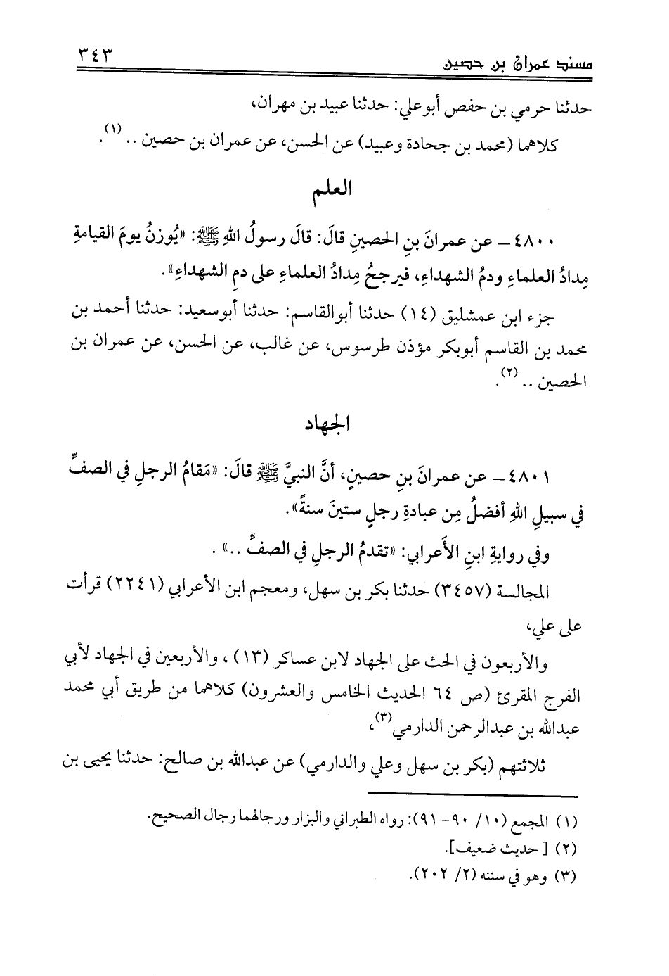 4800 - عن عمرانَ بنِ الحصينِ قالَ: قالَ رسولُ اللهِ صلى الله عليه وسلم: «يُوزنُ يومَ القيامةِ مِدادُ العلماءِ ودمُ الشهداءِ، فيرجحُ مِدادُ العلماءِ على دمِ الشهداءِ».