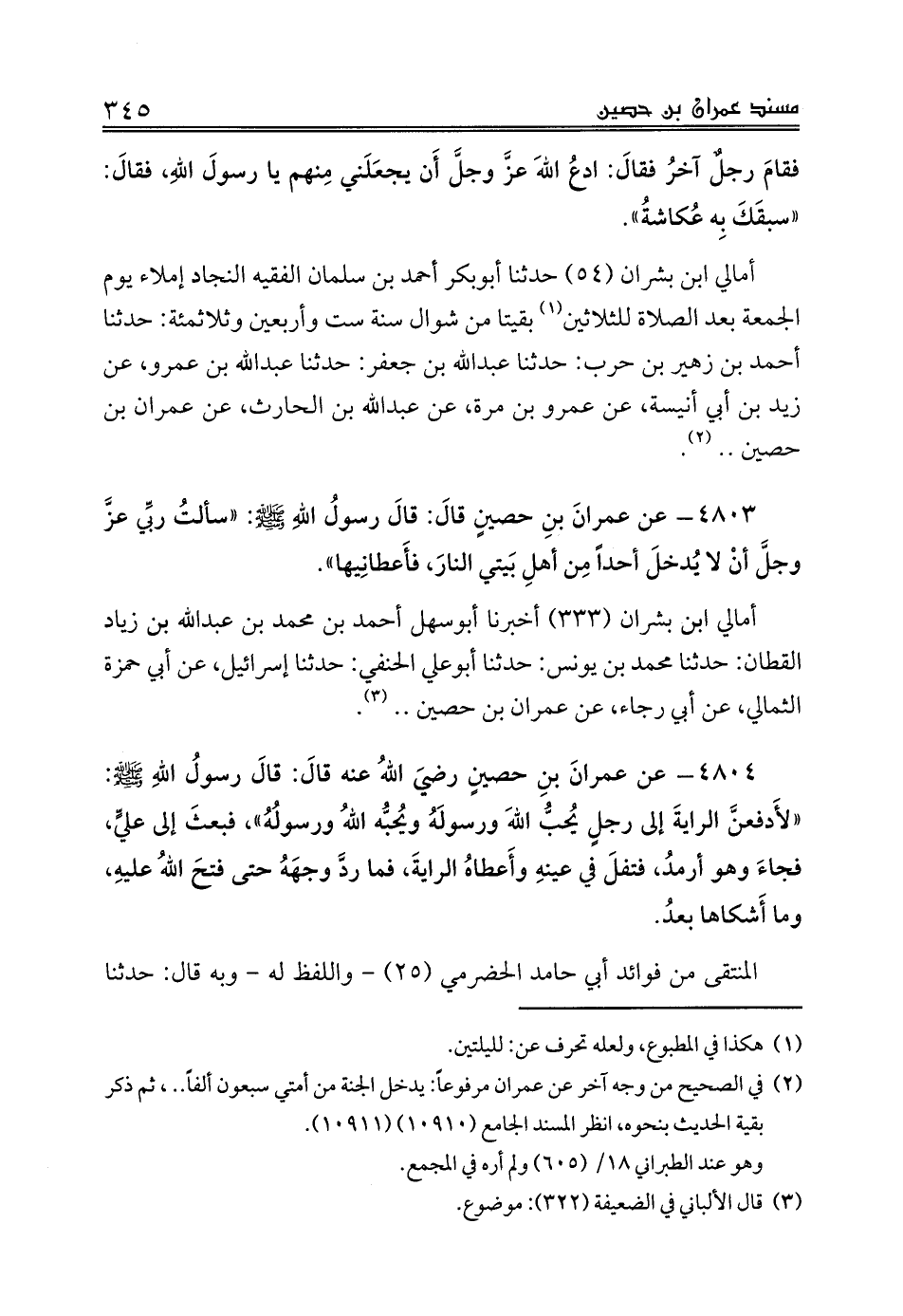 أمالي ابن بشران (54) حدثنا أبوبكر أحمد بن سلمان الفقيه النجاد إملاء يوم الجمعة بعد الصلاة للثلاثين (¬1) بقيتا من شوال سنة ست وأربعين وثلثمئة: حدثنا أحمد بن زهير بن حرب: حدثنا عبدالله بن جعفر: حدثنا عبدالله بن عمرو، عن زيد بن أبي أنيسة، عن عمرو بن مرة، عن عبدالله بن الحارث، عن عمران بن حصين .. (¬2).