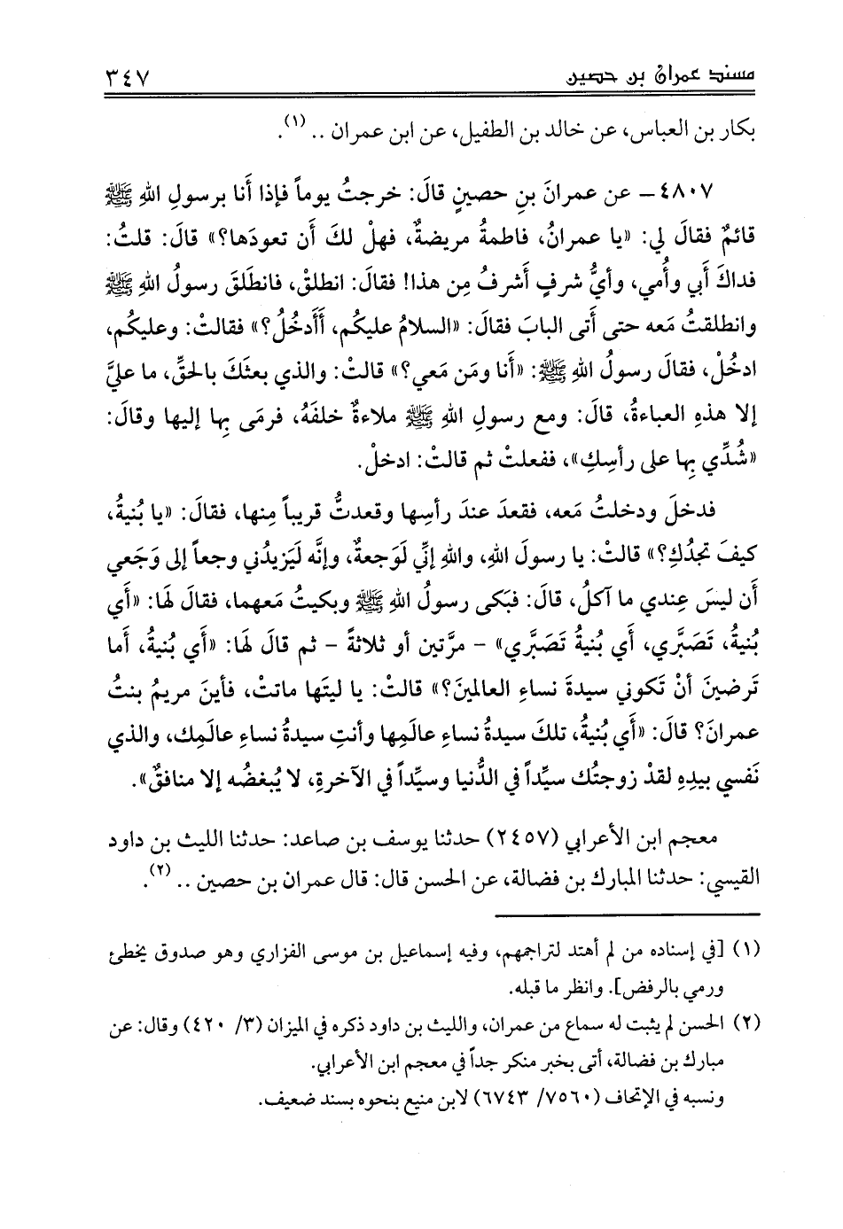 4807 - عن عمرانَ بنِ حصينٍ قالَ: خرجتُ يوماً فإذا أَنا برسولِ اللهِ صلى الله عليه وسلم قائمٌ فقالَ لي: «يا عمرانُ، فاطمةُ مريضةٌ، فهلْ لكَ أَن تعودَها؟» قالَ: قلتُ: فداكَ أَبي وأُمي، وأيُّ شرفٍ أَشرفُ مِن هذا! فقالَ: انطلقْ، فانطَلقَ رسولُ اللهِ صلى الله عليه وسلم وانطلقتُ مَعه حتى أَتى البابَ فقالَ: «السلامُ عليكُم، أَأَدخُلُ؟» فقالتْ: وعليكُم، ادخُلْ، فقالَ رسولُ اللهِ صلى الله عليه وسلم: «أَنا ومَن مَعي؟» قالتْ: والذي بعثَكَ بالحقِّ، ما عليَّ إلا هذهِ العباءةُ، قالَ: ومع رسولِ اللهِ صلى الله عليه وسلم ملآةٌ خلفَهُ، فرمَى بِها إليها وقالَ: «شُدِّي بِها على رأسِكِ»، ففعلتْ ثم قالتْ: ادخلْ.