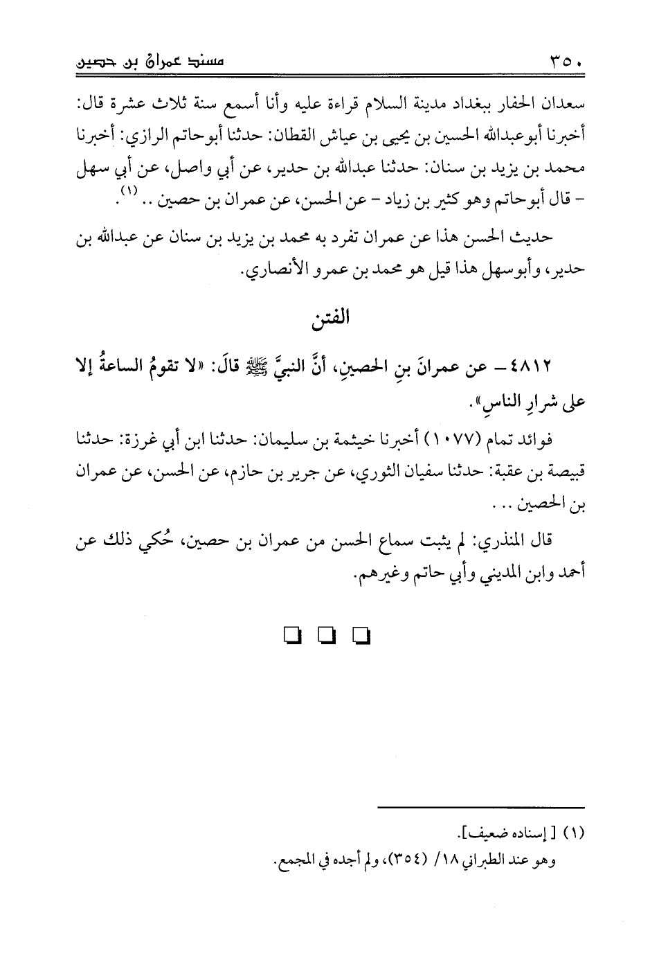 فوائد تمام (1077) أخبرنا خيثمة بن سليمان: حدثنا ابن أبي غرزة: حدثنا قبيصة بن عقبة: حدثنا سفيان الثوري، عن جرير بن حازم، عن الحسن، عن عمران بن الحصين .. .