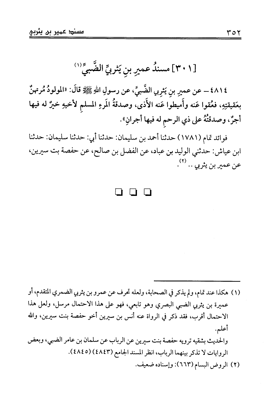4814 - عن عميرِ بنِ يَثرِبي الضَّبيِّ، عن رسولِ اللهِ صلى الله عليه وسلم قالَ: «المولودُ مُرتهنٌ بعَقيقتِهِ، فعُقوا عَنه وأَميطوا عَنه الأَذى، وصدقةُ المَرءِ المسلمِ لأخيهِ خيرٌ له فيها أجرٌ، وصدقتُهُ على ذي الرحمِ له فيها أجرانِ».