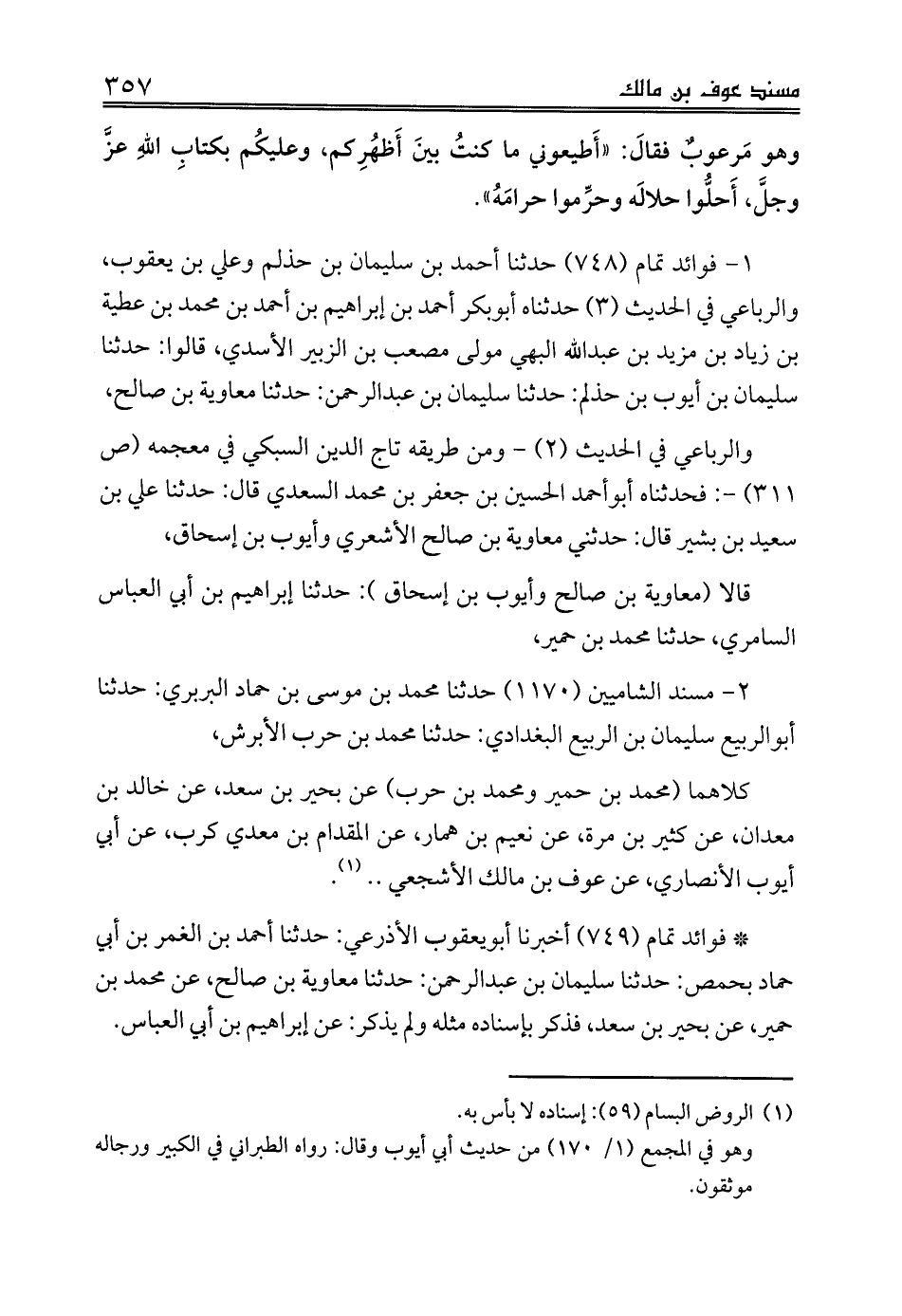 كلاهما (محمد بن حمير ومحمد بن حرب) عن بحير بن سعد، عن خالد بن معدان، عن كثير بن مرة، عن نعيم بن همار، عن المقدام بن معدي كرب، عن أبي أيوب الأنصاري، عن عوف بن مالك الأشجعي .. (¬1).