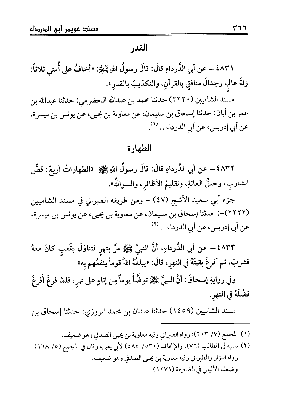 4831 - عن أبي الدَّرداءِ قالَ: قالَ رسولُ اللهِ صلى الله عليه وسلم: «أخافُ على أُمتي ثلاثاً: زلةَ عالمٍ، وجدالَ منافقٍ بالقرآنِ، والتكذيبَ بالقدرِ».