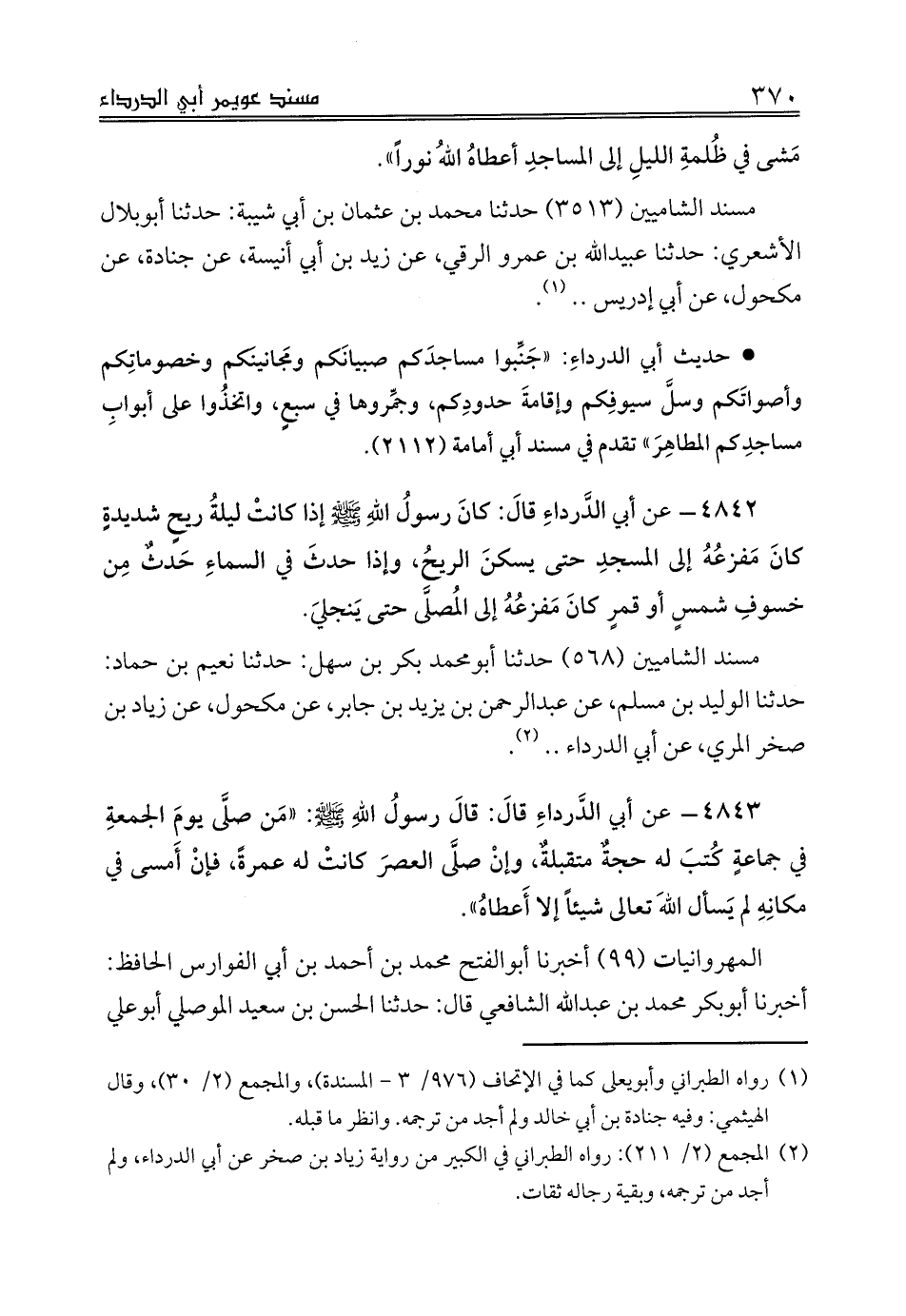 * حديث أبي الدرداءِ: «جَنِّبوا مساجدَكم صبيانَكم ومَجانينَكم وخصوماتِكم وأصواتَكم وسلَّ سيوفِكم وإقامةَ حدودِكم، وجمِّروها في سبعٍ، واتخذُوا على أبوابِ مساجدِكم المطاهِرَ» تقدم في مسند أبي أمامة (2112).