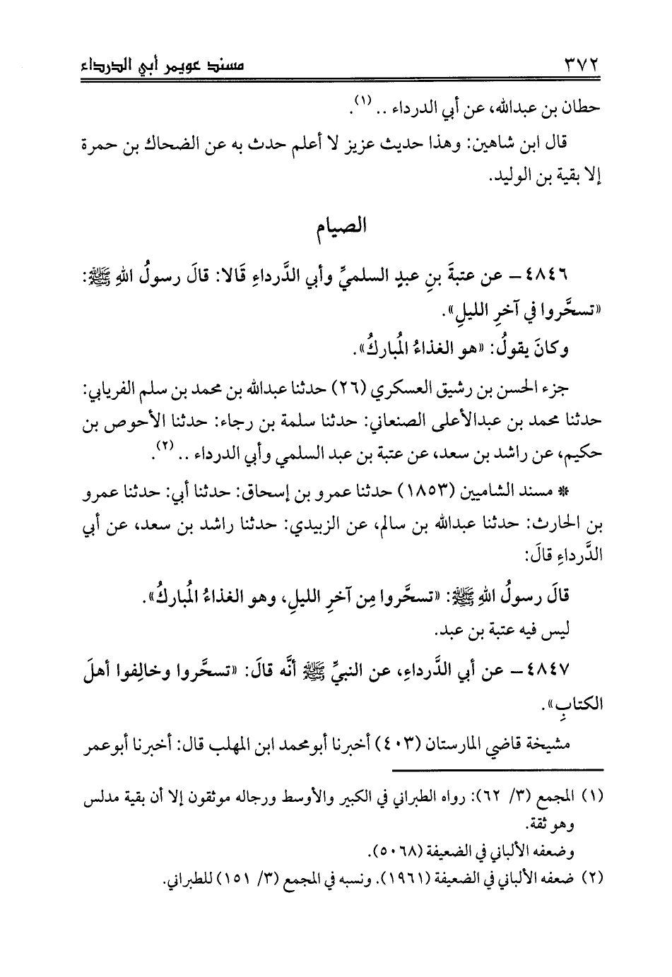 4846 - عن عتبةَ بنِ عبدٍ السلميِّ وأبي الدَّرداءِ قَالا: قالَ رسولُ اللهِ صلى الله عليه وسلم: «تسحَّروا في آخرِ الليلِ».