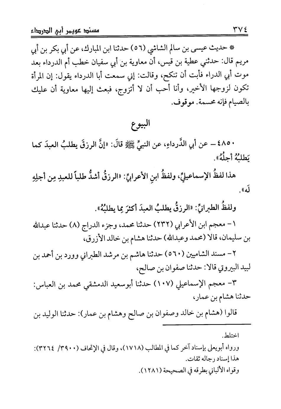 4850 - عن أبي الدَّرداءِ، عن النبيِّ صلى الله عليه وسلم قالَ: «إنَّ الرزقَ يطلبُ العبدَ كما يَطلبُهُ أجلُهُ».
