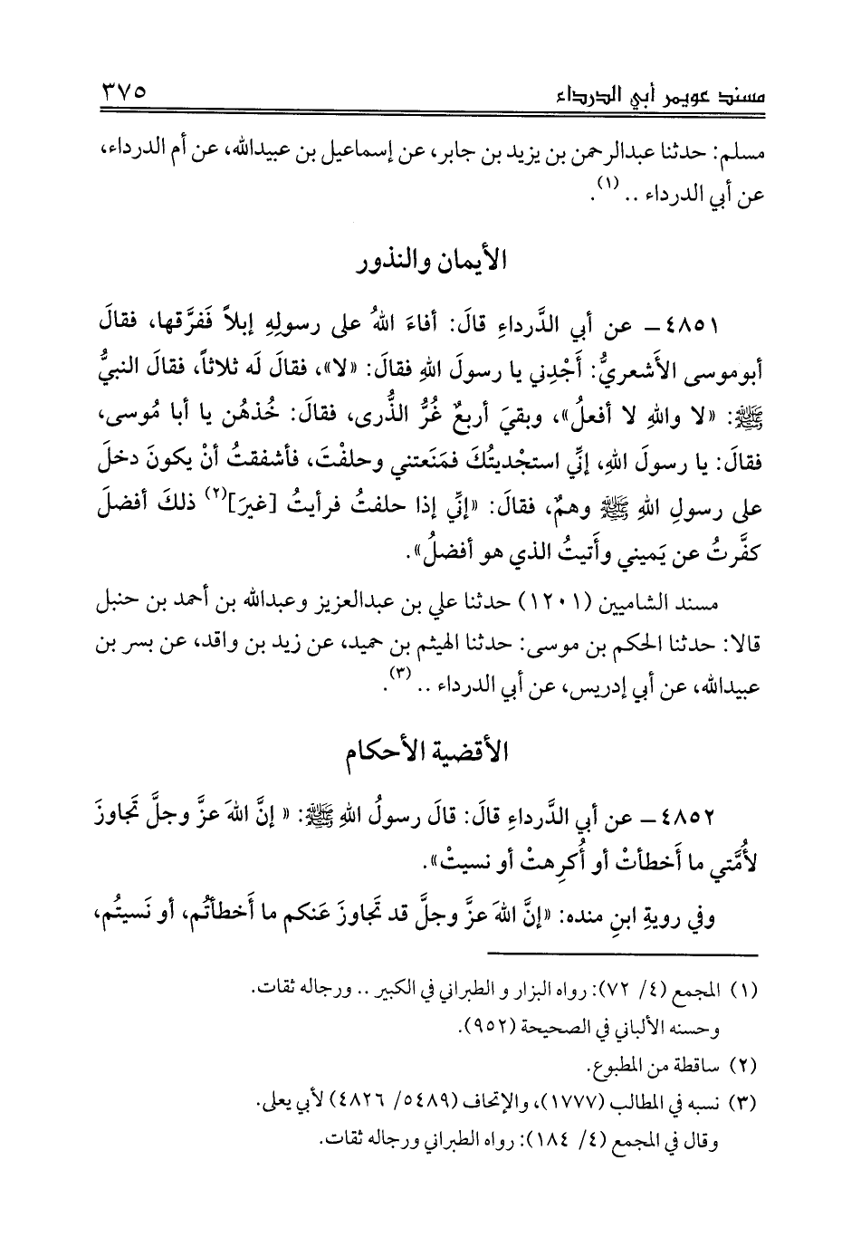 4851 - عن أبي الدَّرداءِ قالَ: أفاءَ اللهُ على رسولِهِ إبلاً فَفرَّقها، فقالَ أبوموسى الأَشعريُّ: أَجْدِني يا رسولَ اللهِ فقالَ: «لا»، فقالَ لَه ثلاثاً، فقالَ النبيُّ صلى الله عليه وسلم: «لا واللهِ لا أفعلُ»، وبقيَ أربعٌ غُرُّ الذُّرى، فقالَ: خُذهُن يا أبا مُوسى، فقالَ: يا رسولَ اللهِ، إنِّي استجْديتُكَ فمَنَعتني وحلفْتَ، فأشفقتُ أنْ يكونَ دخلَ على رسولِ اللهِ صلى الله عليه وسلم وهمٌ، فقالَ: «إنِّي إذا حلفتُ فرأيتُ [غيرَ] (¬2) ذلكَ أفضلَ كفَّرتُ عن يَميني وأَتيتُ الذي هو أفضلُ».