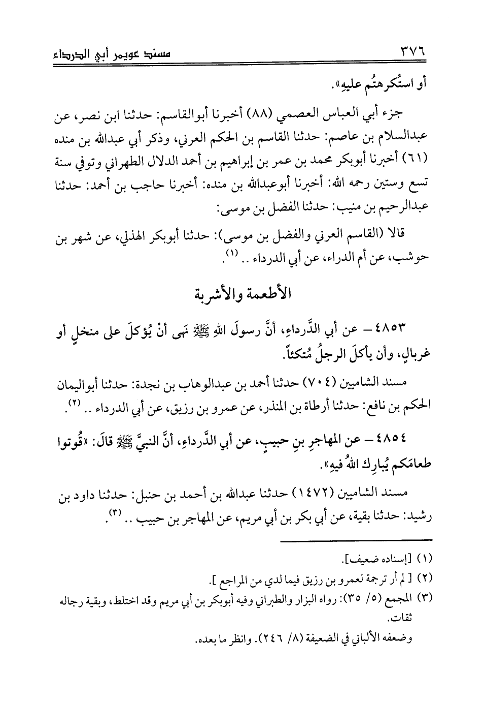 مسند الشاميين (704) حدثنا أحمد بن عبدالوهاب بن نجدة: حدثنا أبواليمان الحكم بن نافع: حدثنا أرطاة بن المنذر، عن عمرو بن رزيق، عن أبي الدرداء .. (¬2).