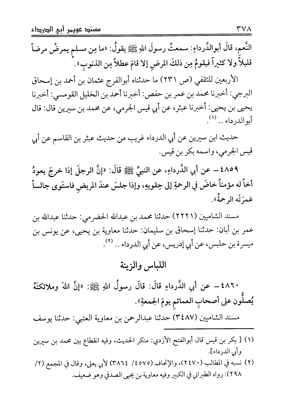 النَّعمِ، قالَ أبوالدَّرداءِ: سمعتُ رسولَ اللهِ صلى الله عليه وسلم يقولُ: «ما مِن مسلمٍ يمرضُ مرضاً قليلاً ولا كثيراً فيقومُ مِن ذلكَ المرضِ إلا قامَ عطلاً مِن الذنوبِ».