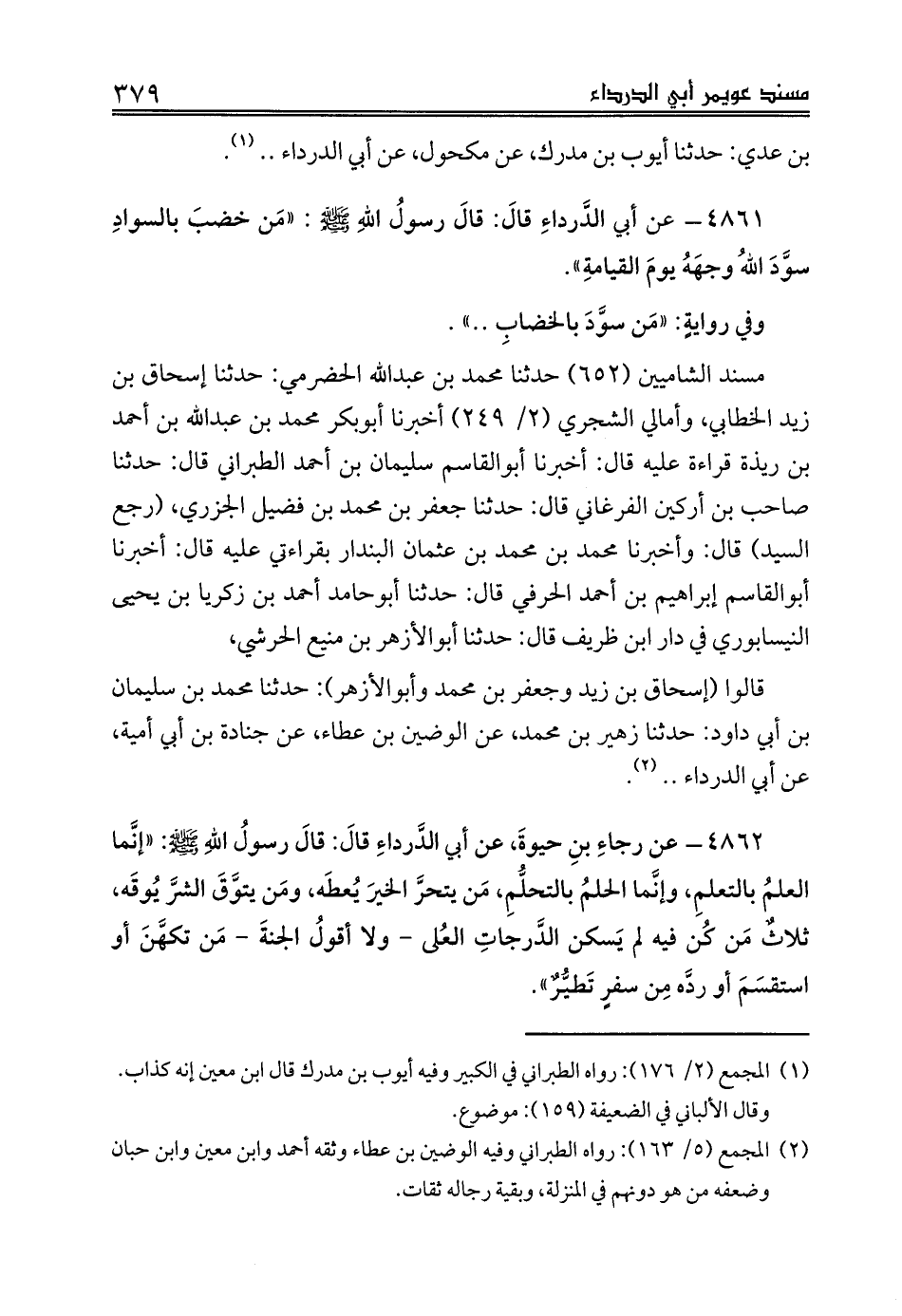 4861 - عن أبي الدَّرداءِ قالَ: قالَ رسولُ اللهِ صلى الله عليه وسلم: «مَن خضبَ بالسوادِ سوَّدَ اللهُ وجهَهُ يومَ القيامةِ».