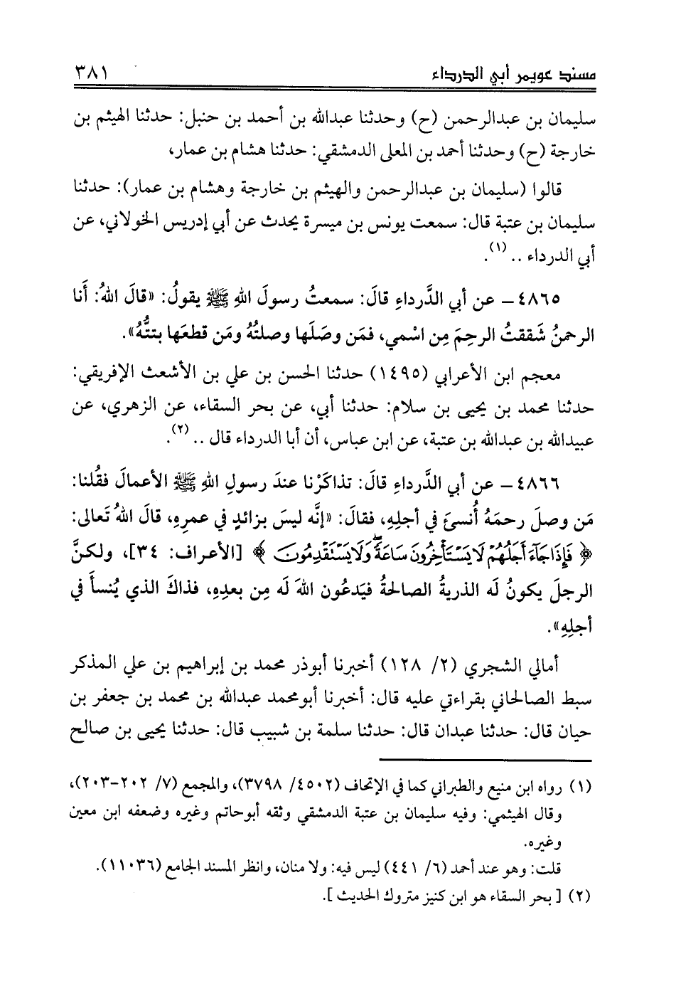 4865 - عن أبي الدَّرداءِ قالَ: سمعتُ رسولَ اللهِ صلى الله عليه وسلم يقولُ: «قالَ اللهُ: أَنا الرحمنُ شَققتُ الرحِمَ مِن اسْمي، فمَن وصَلَها وصلتُهُ ومَن قطعَها بتتُّهُ».