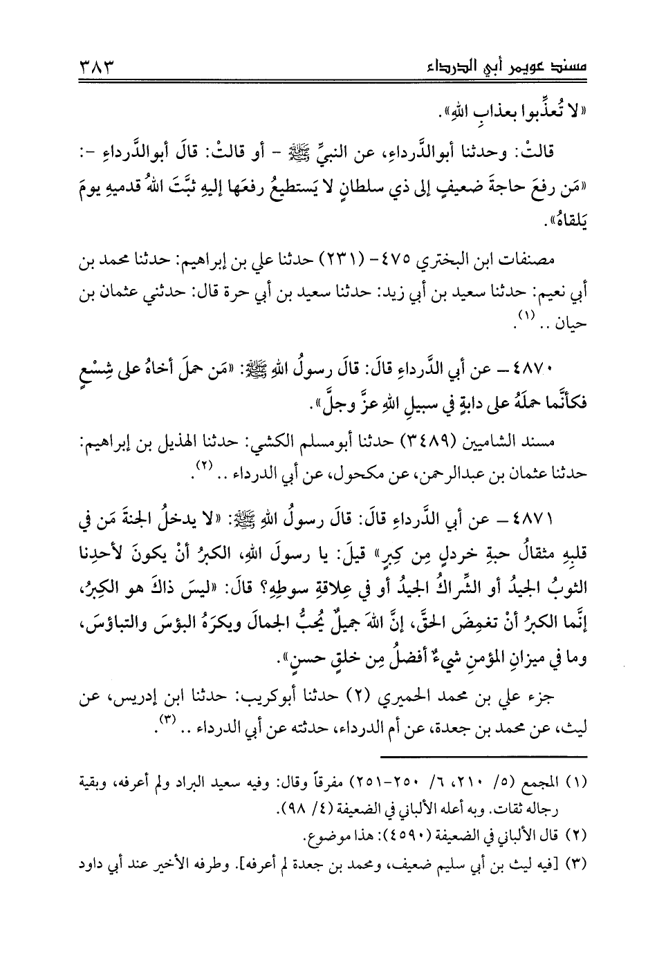 قالتْ: وحدثنا أبوالدَّرداءِ، عن النبيِّ صلى الله عليه وسلم - أو قالتْ: قالَ أبوالدَّرداءِ -: «مَن رفعَ حاجةَ ضعيفٍ إلى ذي سلطانٍ لا يَستطيعُ رفعَها إليهِ ثبَّتَ اللهُ قدميهِ يومَ يَلقاهُ».