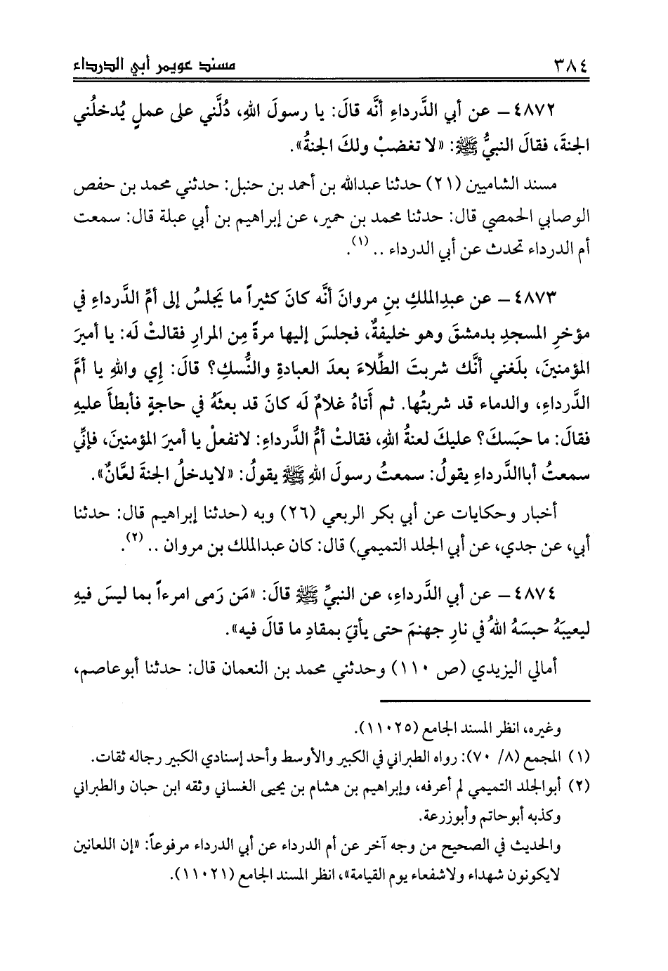 مسند الشاميين (21) حدثنا عبدالله بن أحمد بن حنبل: حدثني محمد بن حفص الوصابي الحمصي قال: حدثنا محمد بن حمير، عن إبراهيم بن أبي عبلة قال: سمعت أم الدرداء تحدث عن أبي الدرداء .. (¬1).