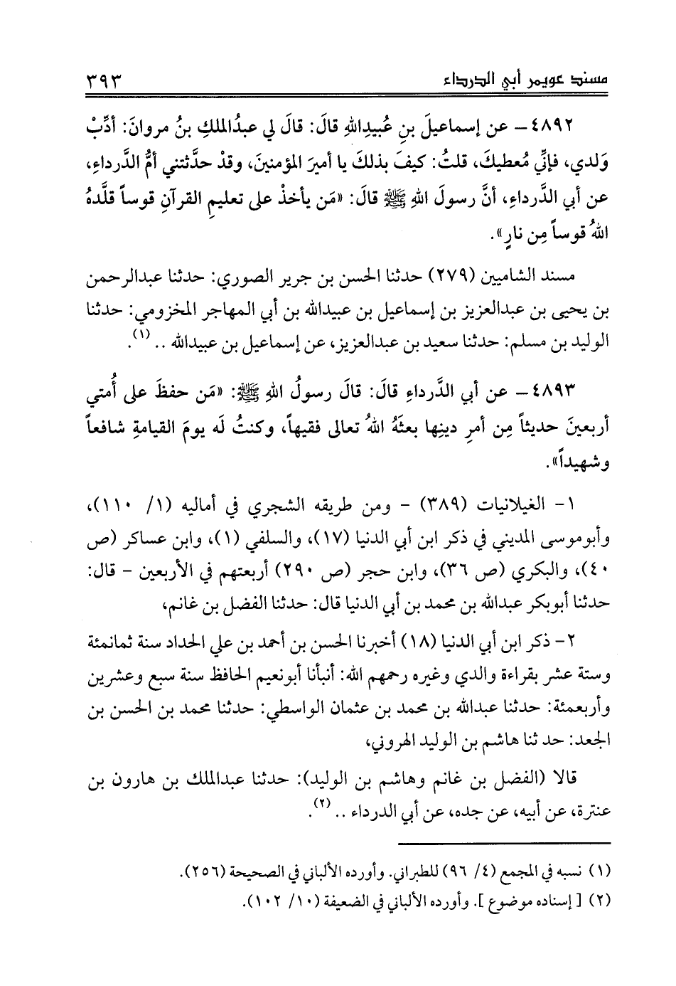 4892 - عن إسماعيلَ بنِ عُبيدِ اللهِ قالَ: قالَ لي عبدُالملكِ بنُ مروانَ: أدِّبْ وَلدي، فإنِّي مُعطيكَ، قلتُ: كيفَ بذلكَ يا أميرَ المؤمنينَ، وقدْ حدَّثتني أمُّ الدَّرداءِ، عن أبي الدَّرداءِ، أنَّ رسولَ اللهِ صلى الله عليه وسلم قالَ: «مَن يأخذْ على تعليمِ القرآنِ قوساً قلَّدهُ اللهُ قوساً مِن نارٍ».